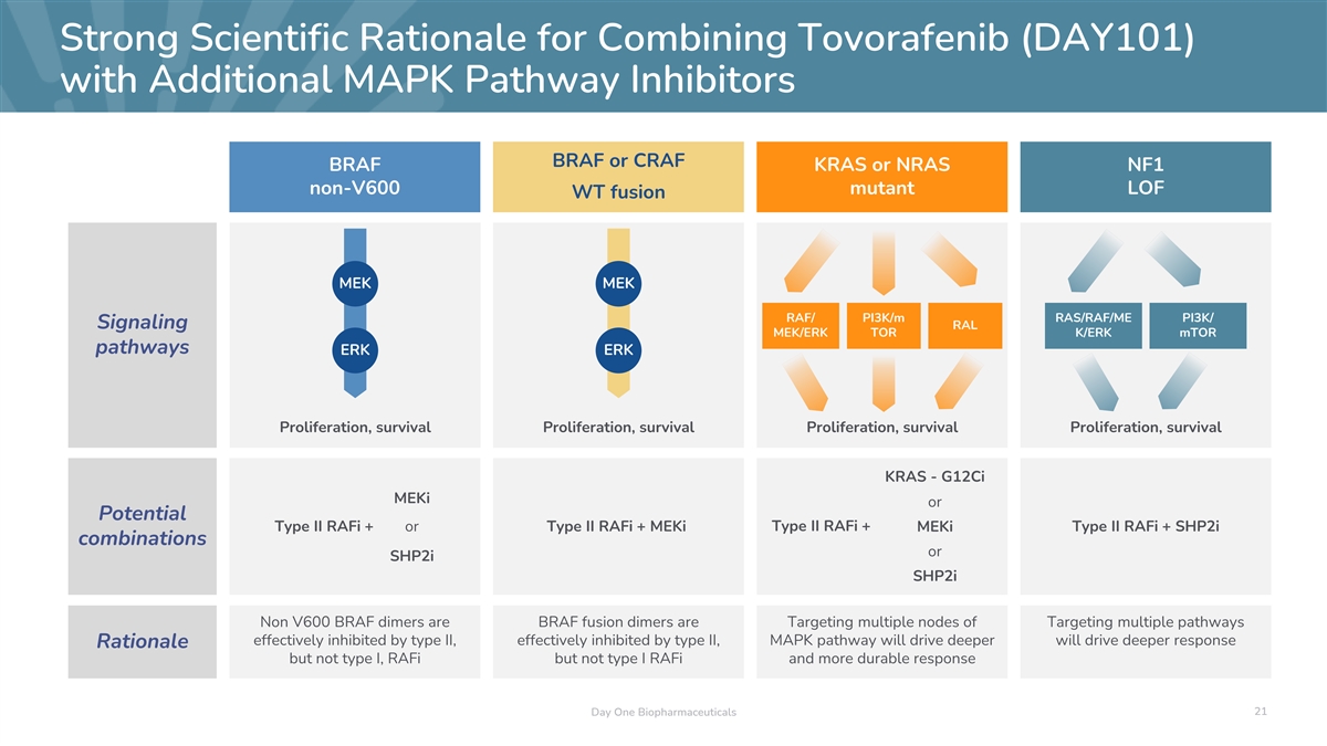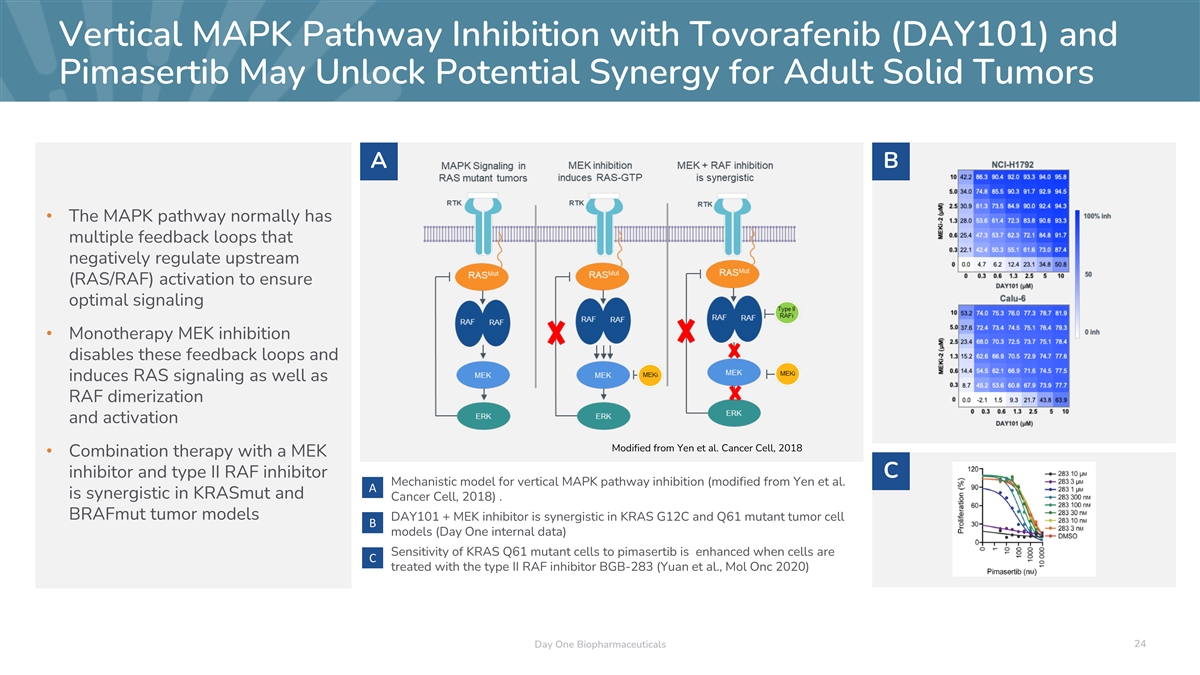 Vertical MAPK Pathway Inhibition with Tovorafenib (DAY101) and Pimasertib May Unlock Potential Synergy for Adult Solid Tumors A B • The MAPK pathway normally has multiple feedback loops that negatively regulate upstream (RAS/RAF) activation to ensure optimal signaling • Monotherapy MEK inhibition disables these feedback loops and induces RAS signaling as well as RAF dimerization and activation Modified from Yen et al. Cancer Cell, 2018 • Combination therapy with a MEK inhibitor and type II RAF inhibitor C Mechanistic model for vertical MAPK pathway inhibition (modified from Yen et al. A is synergistic in KRASmut and Cancer Cell, 2018) . BRAFmut tumor models DAY101 + MEK inhibitor is synergistic in KRAS G12C and Q61 mutant tumor cell B models (Day One internal data) Sensitivity of KRAS Q61 mutant cells to pimasertib is enhanced when cells are C treated with the type II RAF inhibitor BGB-283 (Yuan et al., Mol Onc 2020) Day One Biopharmaceuticals 24