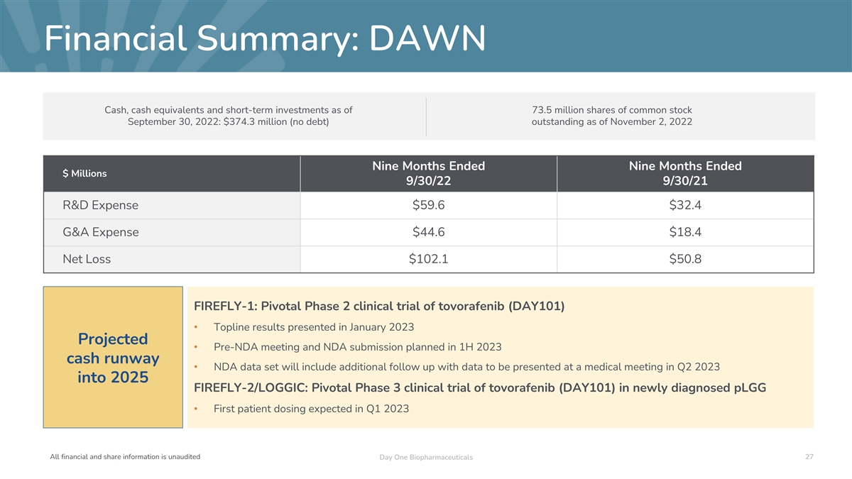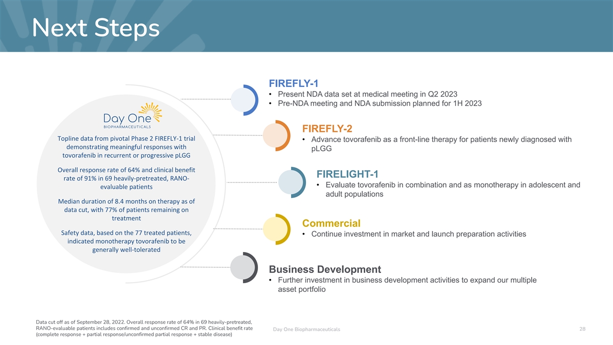 Financial Summary: DAWN Cash, cash equivalents and short-term investments as of 73.5 million shares of common stock September 30, 2022: $374.3 million (no debt) outstanding as of November 2, 2022 Nine Months Ended Nine Months Ended $ Millions 9/30/22 9/30/21 R&D Expense $59.6 $32.4 G&A Expense $44.6 $18.4 Net Loss $102.1 $50.8 FIREFLY-1: Pivotal Phase 2 clinical trial of tovorafenib (DAY101) • Topline results presented in January 2023 Projected • Pre-NDA meeting and NDA submission planned in 1H 2023 cash runway • NDA data set will include additional follow up with data to be presented at a medical meeting in Q2 2023 into 2025 FIREFLY-2/LOGGIC: Pivotal Phase 3 clinical trial of tovorafenib (DAY101) in newly diagnosed pLGG • First patient dosing expected in Q1 2023 All financial and share information is unaudited Day One Biopharmaceuticals 27