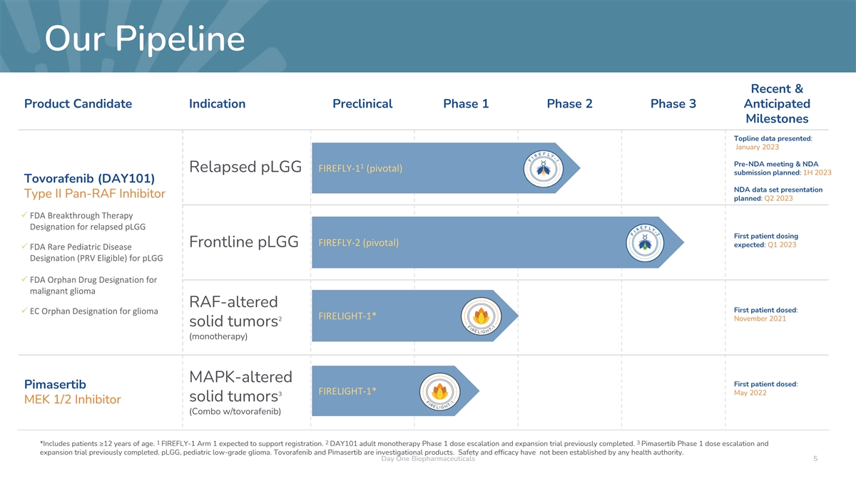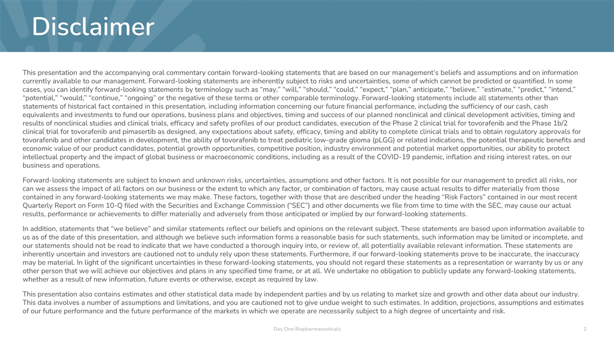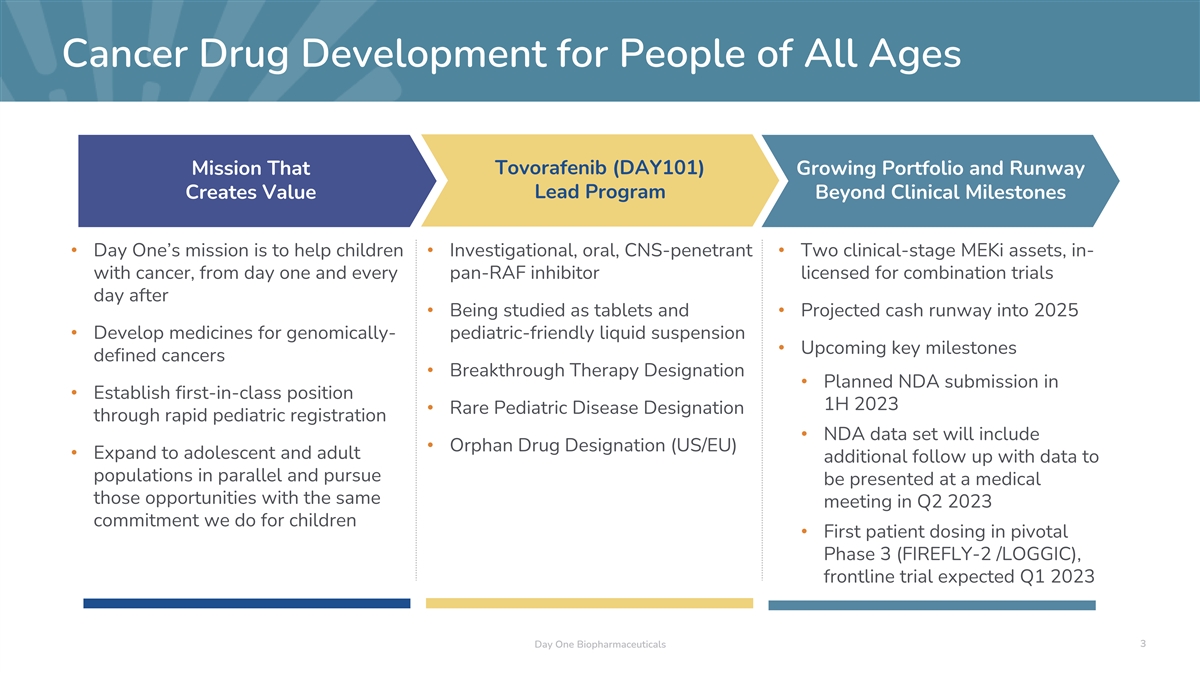 Disclaimer This presentation and the accompanying oral commentary contain forward-looking statements that are based on our management’s beliefs and assumptions and on information currently available to our management. Forward-looking statements are inherently subject to risks and uncertainties, some of which cannot be predicted or quantified. In some cases, you can identify forward-looking statements by terminology such as “may,” “will,” “should,” “could,” “expect,” “plan,” anticipate,” “believe,” “estimate,” “predict,” “intend,” “potential,” “would,” “continue,” “ongoing” or the negative of these terms or other comparable terminology. Forward-looking statements include all statements other than statements of historical fact contained in this presentation, including information concerning our future financial performance, including the sufficiency of our cash, cash equivalents and investments to fund our operations, business plans and objectives, timing and success of our planned nonclinical and clinical development activities, timing and results of nonclinical studies and clinical trials, efficacy and safety profiles of our product candidates, execution of the Phase 2 clinical trial for tovorafenib and the Phase 1b/2 clinical trial for tovorafenib and pimasertib as designed, any expectations about safety, efficacy, timing and ability to complete clinical trials and to obtain regulatory approvals for tovorafenib and other candidates in development, the ability of tovorafenib to treat pediatric low-grade glioma (pLGG) or related indications, the potential therapeutic benefits and economic value of our product candidates, potential growth opportunities, competitive position, industry environment and potential market opportunities, our ability to protect intellectual property and the impact of global business or macroeconomic conditions, including as a result of the COVID-19 pandemic, inflation and rising interest rates, on our business and operations. Forward-looking statements are subject to known and unknown risks, uncertainties, assumptions and other factors. It is not possible for our management to predict all risks, nor can we assess the impact of all factors on our business or the extent to which any factor, or combination of factors, may cause actual results to differ materially from those contained in any forward-looking statements we may make. These factors, together with those that are described under the heading “Risk Factors” contained in our most recent Quarterly Report on Form 10-Q filed with the Securities and Exchange Commission (“SEC”) and other documents we file from time to time with the SEC, may cause our actual results, performance or achievements to differ materially and adversely from those anticipated or implied by our forward-looking statements. In addition, statements that “we believe” and similar statements reflect our beliefs and opinions on the relevant subject. These statements are based upon information available to us as of the date of this presentation, and although we believe such information forms a reasonable basis for such statements, such information may be limited or incomplete, and our statements should not be read to indicate that we have conducted a thorough inquiry into, or review of, all potentially available relevant information. These statements are inherently uncertain and investors are cautioned not to unduly rely upon these statements. Furthermore, if our forward-looking statements prove to be inaccurate, the inaccuracy may be material. In light of the significant uncertainties in these forward-looking statements, you should not regard these statements as a representation or warranty by us or any other person that we will achieve our objectives and plans in any specified time frame, or at all. We undertake no obligation to publicly update any forward-looking statements, whether as a result of new information, future events or otherwise, except as required by law. This presentation also contains estimates and other statistical data made by independent parties and by us relating to market size and growth and other data about our industry. This data involves a number of assumptions and limitations, and you are cautioned not to give undue weight to such estimates. In addition, projections, assumptions and estimates of our future performance and the future performance of the markets in which we operate are necessarily subject to a high degree of uncertainty and risk. Day One Biopharmaceuticals 2