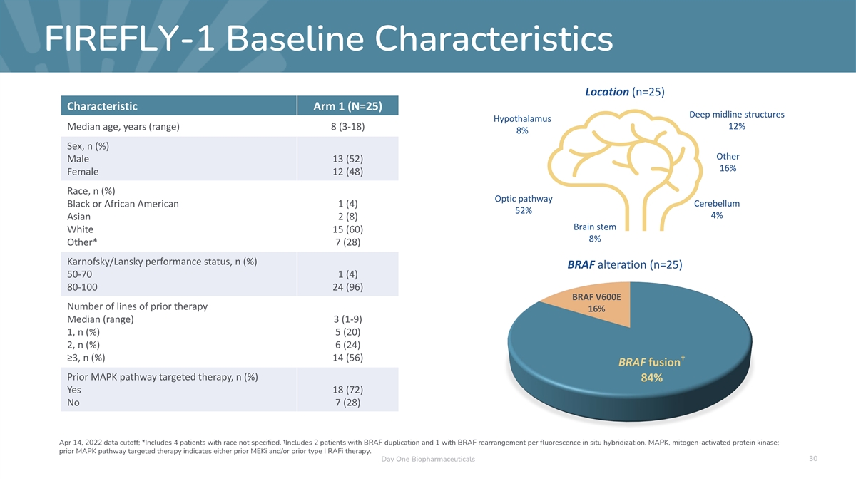 FIREFLY-1 Baseline Characteristics Location (n=25) Characteristic Arm 1 (N=25) Deep midline structures Hypothalamus 12% Median age, years (range) 8 (3-18) 8% Sex, n (%) Other Male 13 (52) 16% Female 12 (48) Race, n (%) Optic pathway Cerebellum Black or African American 1 (4) 52% 4% Asian 2 (8) Brain stem White 15 (60) 8% Other* 7 (28) Karnofsky/Lansky performance status, n (%) BRAF alteration (n=25) 50-70 1 (4) 80-100 24 (96) BRAF V600E Number of lines of prior therapy 16% Median (range) 3 (1-9) 1, n (%) 5 (20) 2, n (%) 6 (24) ≥3, n (%) 14 (56) † BRAF fusion Prior MAPK pathway targeted therapy, n (%) 84% Yes 18 (72) No 7 (28) Apr 14, 2022 data cutoff; *Includes 4 patients with race not specified. †Includes 2 patients with BRAF duplication and 1 with BRAF rearrangement per fluorescence in situ hybridization. MAPK, mitogen-activated protein kinase; prior MAPK pathway targeted therapy indicates either prior MEKi and/or prior type I RAFi therapy. Day One Biopharmaceuticals 30