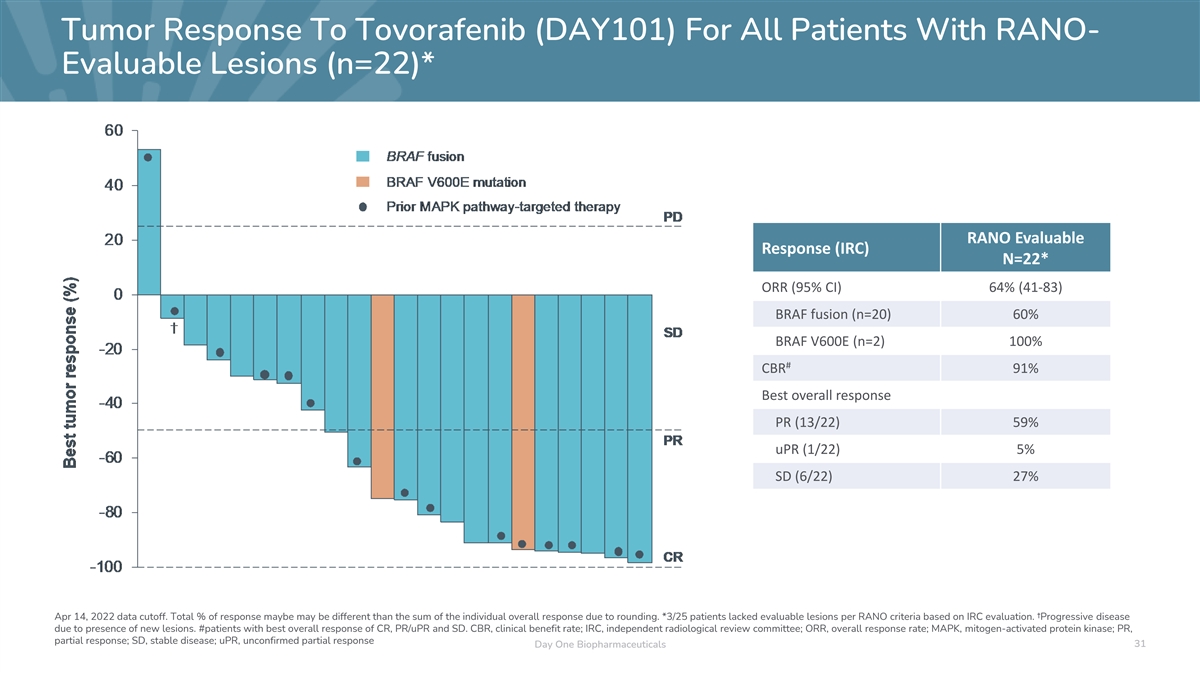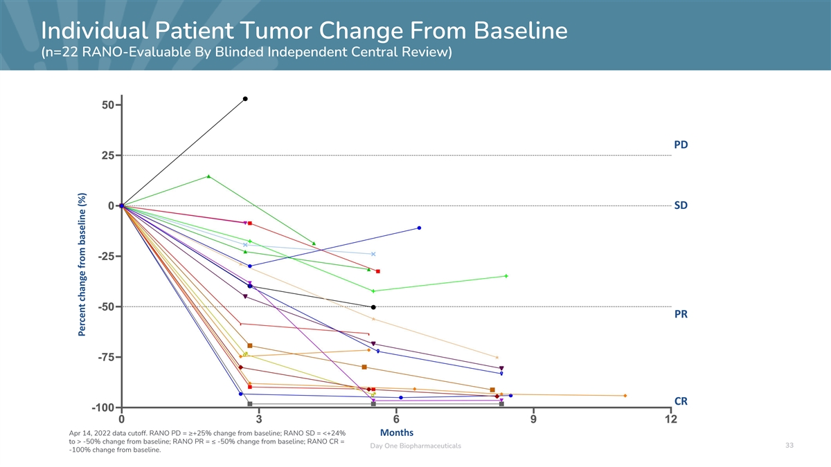 Individual Patient Tumor Change From Baseline (n=22 RANO-Evaluable By Blinded Independent Central Review) PD SD PR CR Apr 14, 2022 data cutoff. RANO PD = ≥+25% change from baseline; RANO SD = <+24% Months to > -50% change from baseline; RANO PR = ≤ -50% change from baseline; RANO CR = Day One Biopharmaceuticals 33 -100% change from baseline. Percent change from baseline (%)