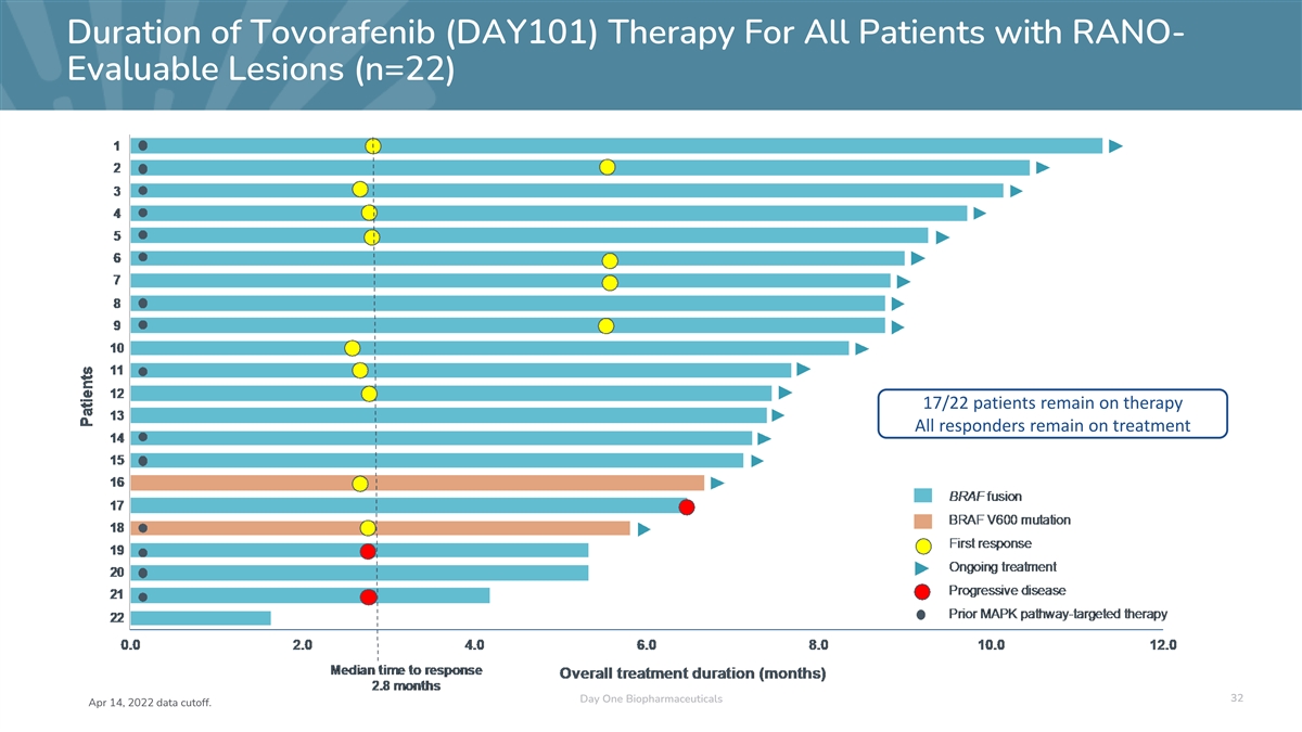 Duration of Tovorafenib (DAY101) Therapy For All Patients with RANO- Evaluable Lesions (n=22) 17/22 patients remain on therapy All responders remain on treatment Day One Biopharmaceuticals 32 Apr 14, 2022 data cutoff.