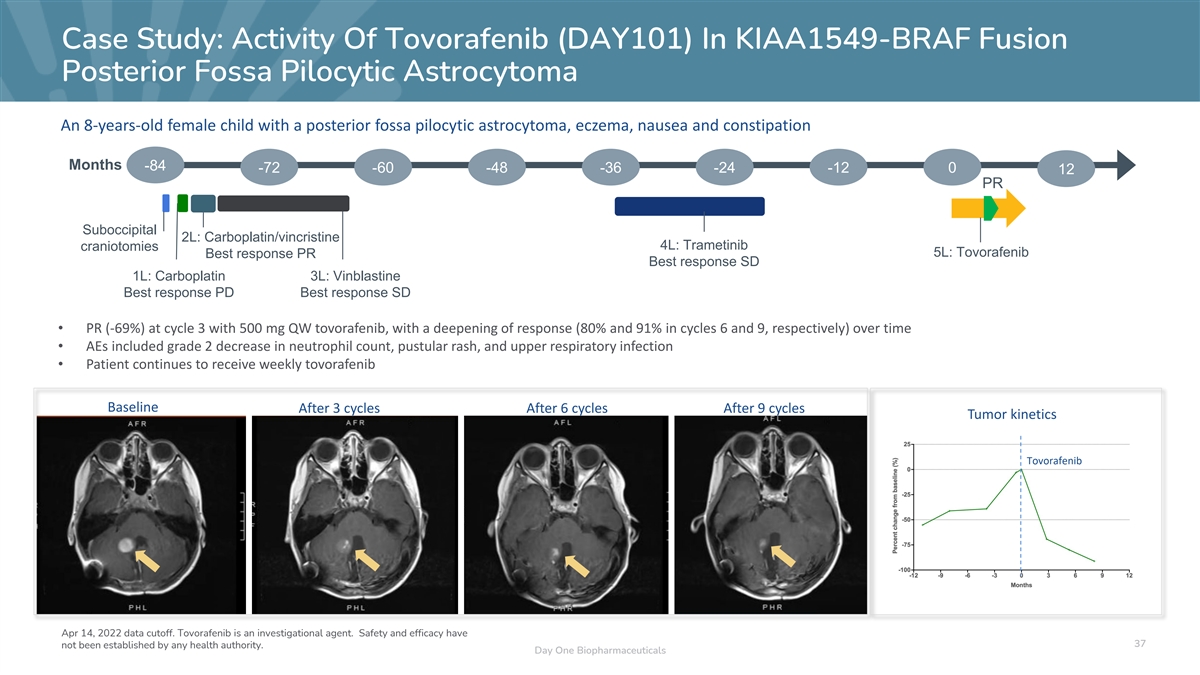 Case Study: Activity Of Tovorafenib (DAY101) In KIAA1549-BRAF Fusion Optic Pathway Glioma A 7-years-old female child with an optic pathway glioma, with very poor vision, entropion, folliculitis, eczema, mouth ulceration and xerosis Months -36 -30 -24 -18 -12 -6 0 6 PR 1L: Vincristine/carboplatin Diagnostic biopsy 3L: Tovorafenib 2L: Trametinib Best response SD Best response PD • PR (-58%) and improvement in vision reported at cycle 3 • AEs included grade 3 erythematous rash requiring dose interruption and dose reduction (400 mg QW to 300 mg QW in cycle 1), and grade 2 eczema and maculopapular rash • Patient continues to receive weekly tovorafenib Baseline After 6 cycles Tumor kinetics (RANO) Tovorafenib Apr 14, 2022 data cutoff. Tovorafenib is an investigational agent. Safety and efficacy have not 36 been established by any health authority. Day One Biopharmaceuticals