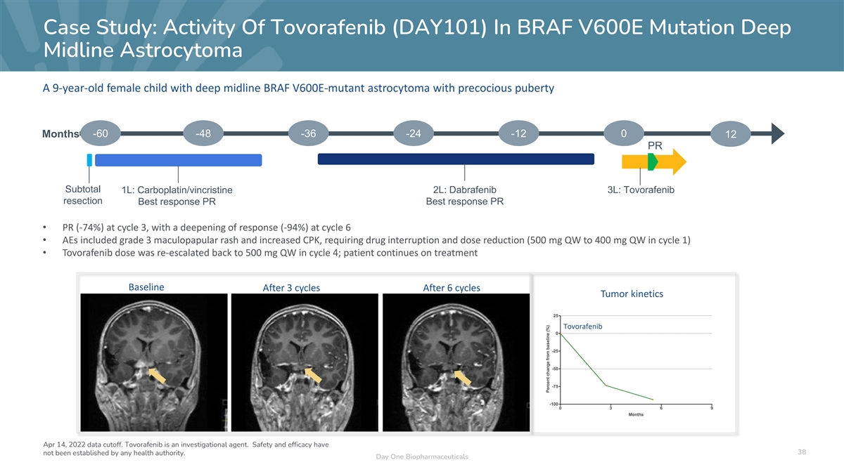 Case Study: Activity Of Tovorafenib (DAY101) In KIAA1549-BRAF Fusion Posterior Fossa Pilocytic Astrocytoma An 8-years-old female child with a posterior fossa pilocytic astrocytoma, eczema, nausea and constipation Months -84 -72 -60 -48 -36 -24 -12 0 12 PR Suboccipital 2L: Carboplatin/vincristine 4L: Trametinib craniotomies 5L: Tovorafenib Best response PR Best response SD 1L: Carboplatin 3L: Vinblastine Best response PD Best response SD • PR (-69%) at cycle 3 with 500 mg QW tovorafenib, with a deepening of response (80% and 91% in cycles 6 and 9, respectively) over time • AEs included grade 2 decrease in neutrophil count, pustular rash, and upper respiratory infection • Patient continues to receive weekly tovorafenib Baseline After 3 cycles After 6 cycles After 9 cycles Tumor kinetics Tovorafenib Apr 14, 2022 data cutoff. Tovorafenib is an investigational agent. Safety and efficacy have 37 not been established by any health authority. Day One Biopharmaceuticals
