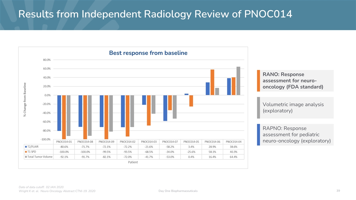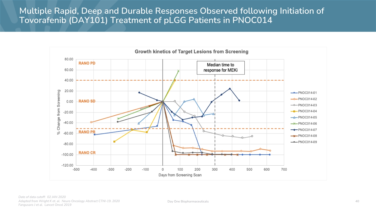 Results from Independent Radiology Review of PNOC014 Best response from baseline RANO: Response assessment for neuro- oncology (FDA standard) Volumetric image analysis (exploratory) RAPNO: Response assessment for pediatric neuro-oncology (exploratory) Date of data cutoff: 02 JAN 2020 Day One Biopharmaceuticals 39 Wright K et. al. Neuro Oncology Abstract CTNI-19. 2020
