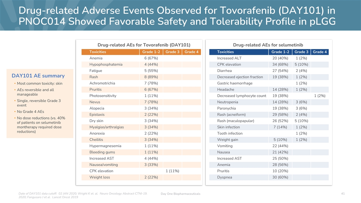 Multiple Rapid, Deep and Durable Responses Observed following Initiation of Tovorafenib (DAY101) Treatment of pLGG Patients in PNOC014 Date of data cutoff: 02 JAN 2020 Adapted from Wright K et. al. Neuro Oncology Abstract CTNI-19. 2020 Day One Biopharmaceuticals 40 Fangusaro J et al. Lancet Oncol 2019