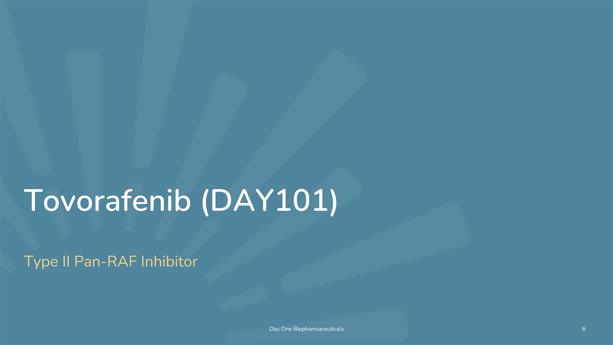 Our Pipeline Recent & Product Candidate Indication Preclinical Phase 1 Phase 2 Phase 3 Anticipated Milestones Topline data presented: January 2023 Pre-NDA meeting & NDA 1 Relapsed pLGG FIREFLY-1 (pivotal) submission planned: 1H 2023 Tovorafenib (DAY101) NDA data set presentation Type II Pan-RAF Inhibitor planned: Q2 2023 ü FDA Breakthrough Therapy Designation for relapsed pLGG First patient dosing FIREFLY-2 (pivotal) Frontline pLGG expected: Q1 2023 ü FDA Rare Pediatric Disease Designation (PRV Eligible) for pLGG ü FDA Orphan Drug Designation for malignant glioma RAF-altered First patient dosed: ü EC Orphan Designation for glioma FIRELIGHT-1* 2 November 2021 solid tumors (monotherapy) MAPK-altered First patient dosed: Pimasertib FIRELIGHT-1* May 2022 3 solid tumors MEK 1/2 Inhibitor (Combo w/tovorafenib) 1 2 3 *Includes patients ≥12 years of age. FIREFLY-1 Arm 1 expected to support registration. DAY101 adult monotherapy Phase 1 dose escalation and expansion trial previously completed. Pimasertib Phase 1 dose escalation and expansion trial previously completed. pLGG, pediatric low-grade glioma. Tovorafenib and Pimasertib are investigational products. Safety and efficacy have not been established by any health authority. Day One Biopharmaceuticals 5