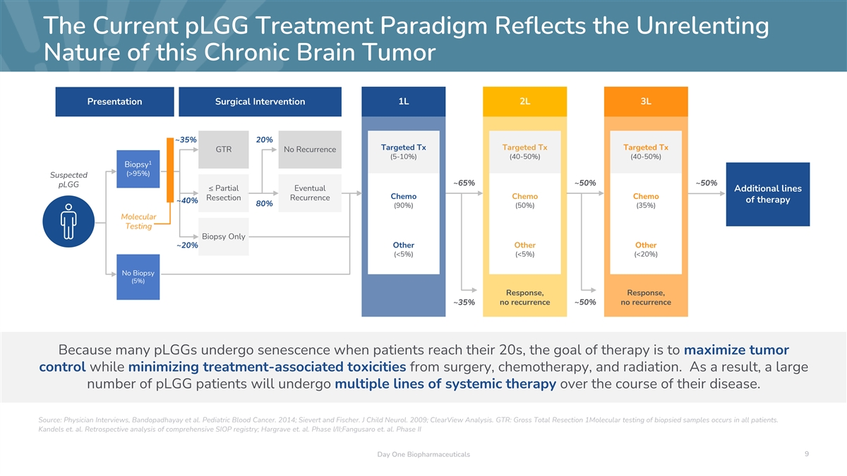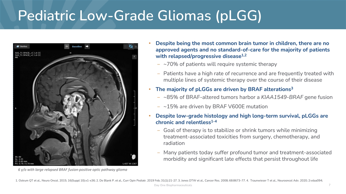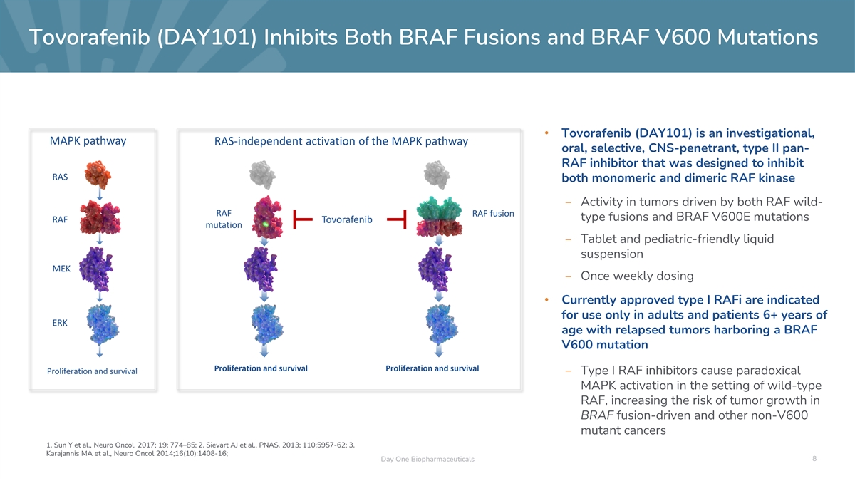 Pediatric Low-Grade Gliomas (pLGG) • Despite being the most common brain tumor in children, there are no approved agents and no standard-of-care for the majority of patients 1,2 with relapsed/progressive disease ‒ ~70% of patients will require systemic therapy ‒ Patients have a high rate of recurrence and are frequently treated with multiple lines of systemic therapy over the course of their disease 3 • The majority of pLGGs are driven by BRAF alterations ‒ ~85% of BRAF-altered tumors harbor a KIAA1549-BRAF gene fusion ‒ ~15% are driven by BRAF V600E mutation • Despite low-grade histology and high long-term survival, pLGGs are 1-4 chronic and relentless ‒ Goal of therapy is to stabilize or shrink tumors while minimizing treatment-associated toxicities from surgery, chemotherapy, and radiation ‒ Many patients today suffer profound tumor and treatment-associated morbidity and significant late effects that persist throughout life 6 y/o with large relapsed BRAF fusion-positive optic pathway glioma 1. Ostrum QT et al., Neuro Oncol. 2015; 16(Suppl 10):x1-x36; 2. De Blank P. et al., Curr Opin Pediatr. 2019 Feb; 31(1):21-27. 3. Jones DTW et al., Cancer Res. 2008; 68:8673–77. 4. Traunwieser T et al., Neurooncol Adv. 2020; 2:vdaa094; Day One Biopharmaceuticals 7