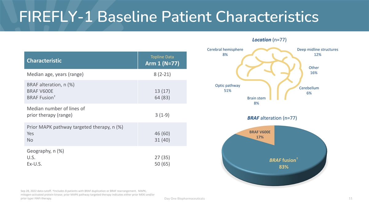 FIREFLY-1 Baseline Characteristics Location (n=25) Characteristic Arm 1 (N=25) Deep midline structures Hypothalamus 12% Median age, years (range) 8 (3-18) 8% Sex, n (%) Other Male 13 (52) 16% Female 12 (48) Race, n (%) Optic pathway Cerebellum Black or African American 1 (4) 52% 4% Asian 2 (8) Brain stem White 15 (60) 8% Other* 7 (28) Karnofsky/Lansky performance status, n (%) BRAF alteration (n=25) 50-70 1 (4) 80-100 24 (96) BRAF V600E Number of lines of prior therapy 16% Median (range) 3 (1-9) 1, n (%) 5 (20) 2, n (%) 6 (24) ≥3, n (%) 14 (56) † BRAF fusion Prior MAPK pathway targeted therapy, n (%) 84% Yes 18 (72) No 7 (28) Apr 14, 2022 data cutoff; *Includes 4 patients with race not specified. †Includes 2 patients with BRAF duplication and 1 with BRAF rearrangement per fluorescence in situ hybridization. MAPK, mitogen-activated protein kinase; prior MAPK pathway targeted therapy indicates either prior MEKi and/or prior type I RAFi therapy. Day One Biopharmaceuticals 30