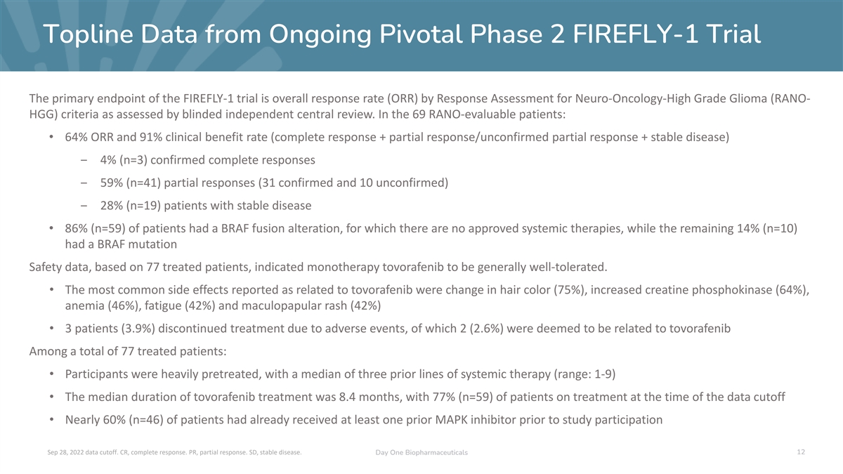 FIREFLY-1 Baseline Patient Characteristics Location (n=77) Cerebral hemisphere Deep midline structures 8% 12% Topline Data Characteristic Arm 1 (N=77) Other 16% Median age, years (range) 8 (2-21) BRAF alteration, n (%) Optic pathway Cerebellum 51% BRAF V600E 13 (17) 6% † BRAF Fusion 64 (83) Brain stem 8% Median number of lines of prior therapy (range) 3 (1-9) BRAF alteration (n=77) Prior MAPK pathway targeted therapy, n (%) BRAF V600E Yes 46 (60) 17% No 31 (40) Geography, n (%) U.S. 27 (35) † BRAF fusion Ex-U.S. 50 (65) 83% Sep 28, 2022 data cutoff. †Includes 8 patients with BRAF duplication or BRAF rearrangement. MAPK, mitogen-activated protein kinase; prior MAPK pathway targeted therapy indicates either prior MEKi and/or prior type I RAFi therapy. Day One Biopharmaceuticals 11