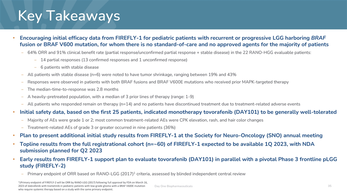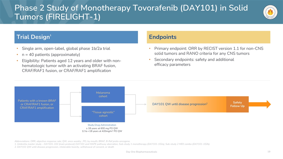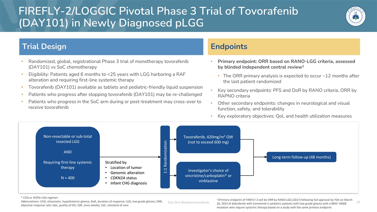 FIREFLY-2/LOGGIC Pivotal Phase 3 Trial of Tovorafenib (DAY101) in Newly Diagnosed pLGG Day One Biopharmaceuticals 14
