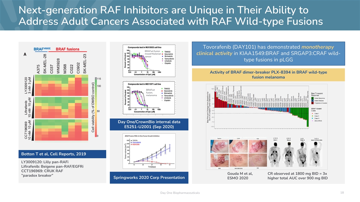 Our Pipeline Recent & Product Candidate Indication Preclinical Phase 1 Phase 2 Phase 3 Anticipated Milestones Topline data presented: January 2023 Pre-NDA meeting & NDA 1 Relapsed pLGG FIREFLY-1 (pivotal) submission planned: Q2 2023 Tovorafenib (DAY101) NDA data set presentation Type II Pan-RAF Inhibitor planned: Q2 2023 ü FDA Breakthrough Therapy Designation for relapsed pLGG First patient dosed: FIREFLY-2 (pivotal) Frontline pLGG ü FDA Rare Pediatric Disease March 2023 Designation (PRV Eligible) for pLGG ü FDA Orphan Drug Designation for malignant glioma First patient dosed: RAF-altered November 2021 ü EC Orphan Designation for glioma FIRELIGHT-1* 2 solid tumors Abstract accepted for presentation: Q2 2023 (monotherapy) MAPK-altered First patient dosed: Pimasertib FIRELIGHT-1* May 2022 3 solid tumors MEK 1/2 Inhibitor (Combo w/tovorafenib) 1 2 3 *Includes patients ≥12 years of age. FIREFLY-1 Arm 1 expected to support registration. DAY101 adult monotherapy Phase 1 dose escalation and expansion trial previously completed. Pimasertib Phase 1 dose escalation and expansion trial previously completed. pLGG, pediatric low-grade glioma. Tovorafenib and Pimasertib are investigational products. Safety and efficacy have not been established by any health authority. Day One Biopharmaceuticals 17