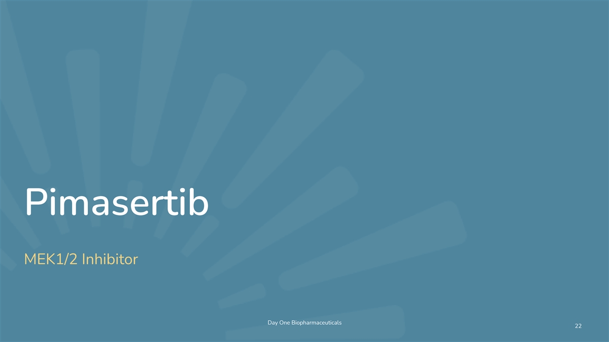 Strong Scientific Rationale for Combining Tovorafenib (DAY101) with Additional MAPK Pathway Inhibitors BRAF or CRAF BRAF KRAS or NRAS NF1 non-V600 mutant LOF WT fusion MEK MEK RAF/ PI3K/m RAS/RAF/ME PI3K/ Signaling RAL MEK/ERK TOR K/ERK mTOR pathways ERK ERK Proliferation, survival Proliferation, survival Proliferation, survival Proliferation, survival KRAS - G12Ci MEKi or Potential Type II RAFi + or Type II RAFi + MEKi Type II RAFi + MEKi Type II RAFi + SHP2i combinations or SHP2i SHP2i Non V600 BRAF dimers are BRAF fusion dimers are Targeting multiple nodes of Targeting multiple pathways effectively inhibited by type II, effectively inhibited by type II, MAPK pathway will drive deeper will drive deeper response Rationale but not type I, RAFi but not type I RAFi and more durable response Day One Biopharmaceuticals 21