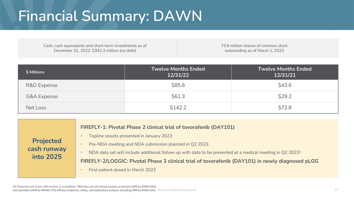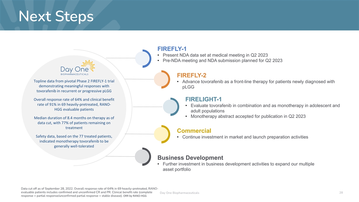 Financial Summary: DAWN Cash, cash equivalents and short-term investments as of 73.6 million shares of common stock December 31, 2022: $342.3 million (no debt) outstanding as of March 1, 2023 Twelve Months Ended Twelve Months Ended $ Millions 12/31/22 12/31/21 R&D Expense $85.6 $43.6 G&A Expense $61.3 $29.2 Net Loss $142.2 $72.8 FIREFLY-1: Pivotal Phase 2 clinical trial of tovorafenib (DAY101) • Topline results presented in January 2023 Projected • Pre-NDA meeting and NDA submission planned in Q2 2023 cash runway 1 • NDA data set will include additional follow up with data to be presented at a medical meeting in Q2 2023 into 2025 FIREFLY-2/LOGGIC: Pivotal Phase 3 clinical trial of tovorafenib (DAY101) in newly diagnosed pLGG • First patient dosed in March 2023 1 All financial and share information is unaudited. NDA data set will include analysis of primary (ORR by RANO-HGG) Day One Biopharmaceuticals 27 and secondary (ORR by RAPNO, PFS) efficacy endpoints, safety, and exploratory analyses (including ORR by RANO-LGG).