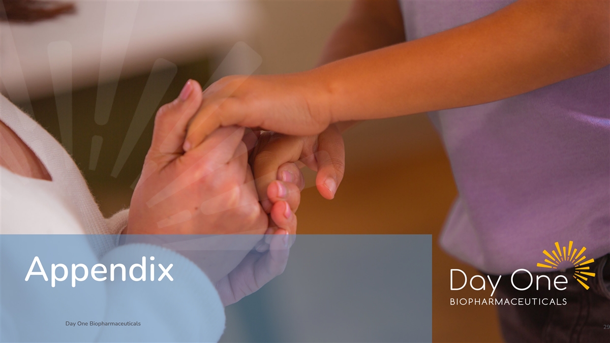Next Steps FIREFLY-1 • Present NDA data set at medical meeting in Q2 2023 • Pre-NDA meeting and NDA submission planned for Q2 2023 FIREFLY-2 Topline data from pivotal Phase 2 FIREFLY-1 trial • Advance tovorafenib as a front-line therapy for patients newly diagnosed with demonstrating meaningful responses with pLGG tovorafenib in recurrent or progressive pLGG Overall response rate of 64% and clinical benefit FIRELIGHT-1 rate of 91% in 69 heavily-pretreated, RANO- • Evaluate tovorafenib in combination and as monotherapy in adolescent and HGG evaluable patients adult populations • Monotherapy abstract accepted for publication in Q2 2023 Median duration of 8.4 months on therapy as of data cut, with 77% of patients remaining on treatment Commercial Safety data, based on the 77 treated patients, • Continue investment in market and launch preparation activities indicated monotherapy tovorafenib to be generally well-tolerated Business Development • Further investment in business development activities to expand our multiple asset portfolio Data cut off as of September 28, 2022. Overall response rate of 64% in 69 heavily-pretreated, RANO- evaluable patients includes confirmed and unconfirmed CR and PR. Clinical benefit rate (complete Day One Biopharmaceuticals 28 response + partial response/unconfirmed partial response + stable disease). ORR by RANO-HGG