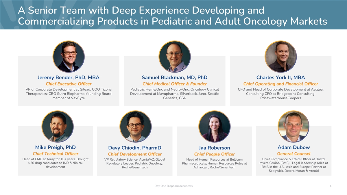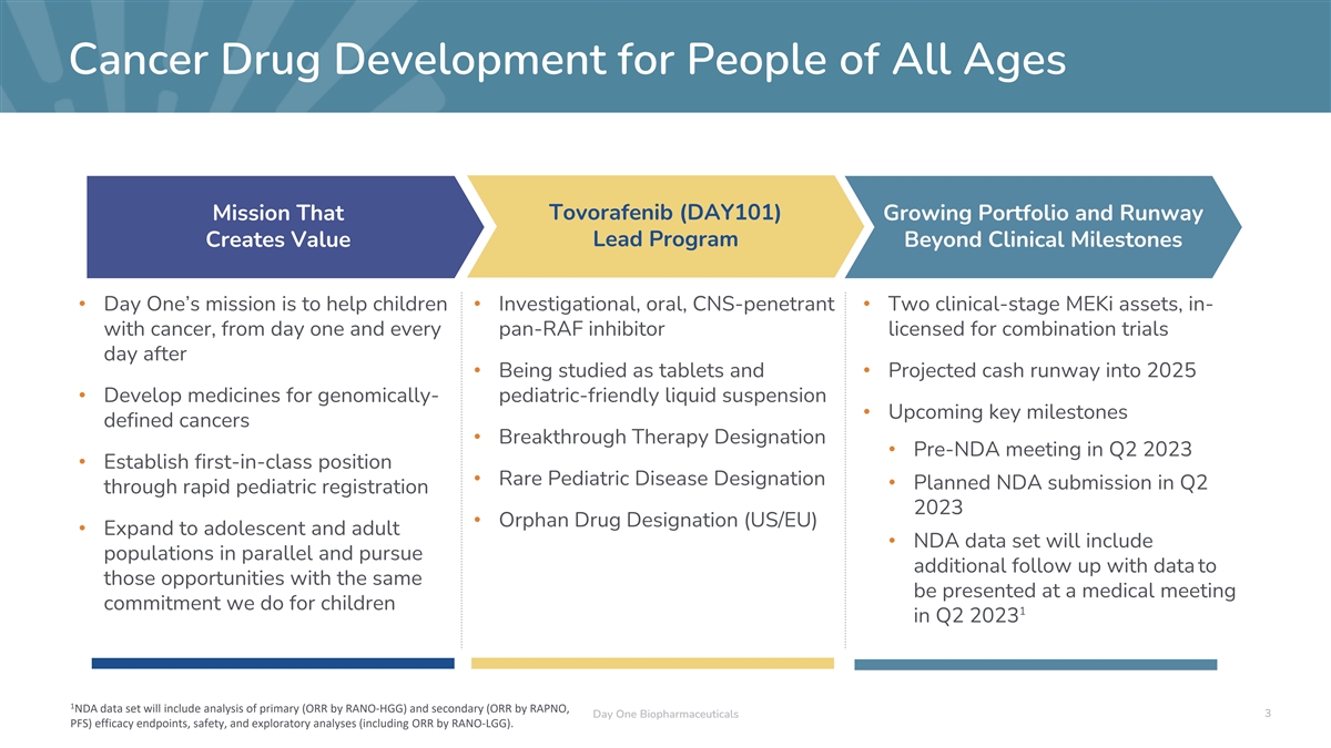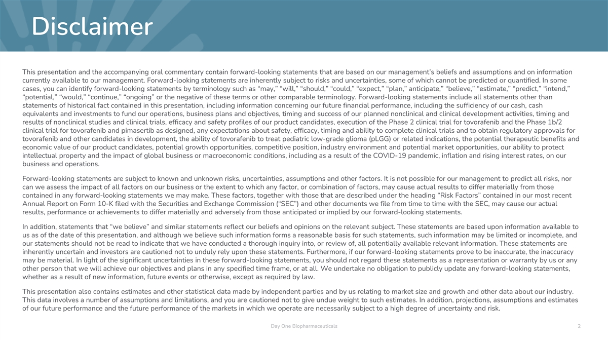 Disclaimer This presentation and the accompanying oral commentary contain forward-looking statements that are based on our management’s beliefs and assumptions and on information currently available to our management. Forward-looking statements are inherently subject to risks and uncertainties, some of which cannot be predicted or quantified. In some cases, you can identify forward-looking statements by terminology such as “may,” “will,” “should,” “could,” “expect,” “plan,” anticipate,” “believe,” “estimate,” “predict,” “intend,” “potential,” “would,” “continue,” “ongoing” or the negative of these terms or other comparable terminology. Forward-looking statements include all statements other than statements of historical fact contained in this presentation, including information concerning our future financial performance, including the sufficiency of our cash, cash equivalents and investments to fund our operations, business plans and objectives, timing and success of our planned nonclinical and clinical development activities, timing and results of nonclinical studies and clinical trials, efficacy and safety profiles of our product candidates, execution of the Phase 2 clinical trial for tovorafenib and the Phase 1b/2 clinical trial for tovorafenib and pimasertib as designed, any expectations about safety, efficacy, timing and ability to complete clinical trials and to obtain regulatory approvals for tovorafenib and other candidates in development, the ability of tovorafenib to treat pediatric low-grade glioma (pLGG) or related indications, the potential therapeutic benefits and economic value of our product candidates, potential growth opportunities, competitive position, industry environment and potential market opportunities, our ability to protect intellectual property and the impact of global business or macroeconomic conditions, including as a result of the COVID-19 pandemic, inflation and rising interest rates, on our business and operations. Forward-looking statements are subject to known and unknown risks, uncertainties, assumptions and other factors. It is not possible for our management to predict all risks, nor can we assess the impact of all factors on our business or the extent to which any factor, or combination of factors, may cause actual results to differ materially from those contained in any forward-looking statements we may make. These factors, together with those that are described under the heading “Risk Factors” contained in our most recent Annual Report on Form 10-K filed with the Securities and Exchange Commission (“SEC”) and other documents we file from time to time with the SEC, may cause our actual results, performance or achievements to differ materially and adversely from those anticipated or implied by our forward-looking statements. In addition, statements that “we believe” and similar statements reflect our beliefs and opinions on the relevant subject. These statements are based upon information available to us as of the date of this presentation, and although we believe such information forms a reasonable basis for such statements, such information may be limited or incomplete, and our statements should not be read to indicate that we have conducted a thorough inquiry into, or review of, all potentially available relevant information. These statements are inherently uncertain and investors are cautioned not to unduly rely upon these statements. Furthermore, if our forward-looking statements prove to be inaccurate, the inaccuracy may be material. In light of the significant uncertainties in these forward-looking statements, you should not regard these statements as a representation or warranty by us or any other person that we will achieve our objectives and plans in any specified time frame, or at all. We undertake no obligation to publicly update any forward-looking statements, whether as a result of new information, future events or otherwise, except as required by law. This presentation also contains estimates and other statistical data made by independent parties and by us relating to market size and growth and other data about our industry. This data involves a number of assumptions and limitations, and you are cautioned not to give undue weight to such estimates. In addition, projections, assumptions and estimates of our future performance and the future performance of the markets in which we operate are necessarily subject to a high degree of uncertainty and risk. Day One Biopharmaceuticals 2