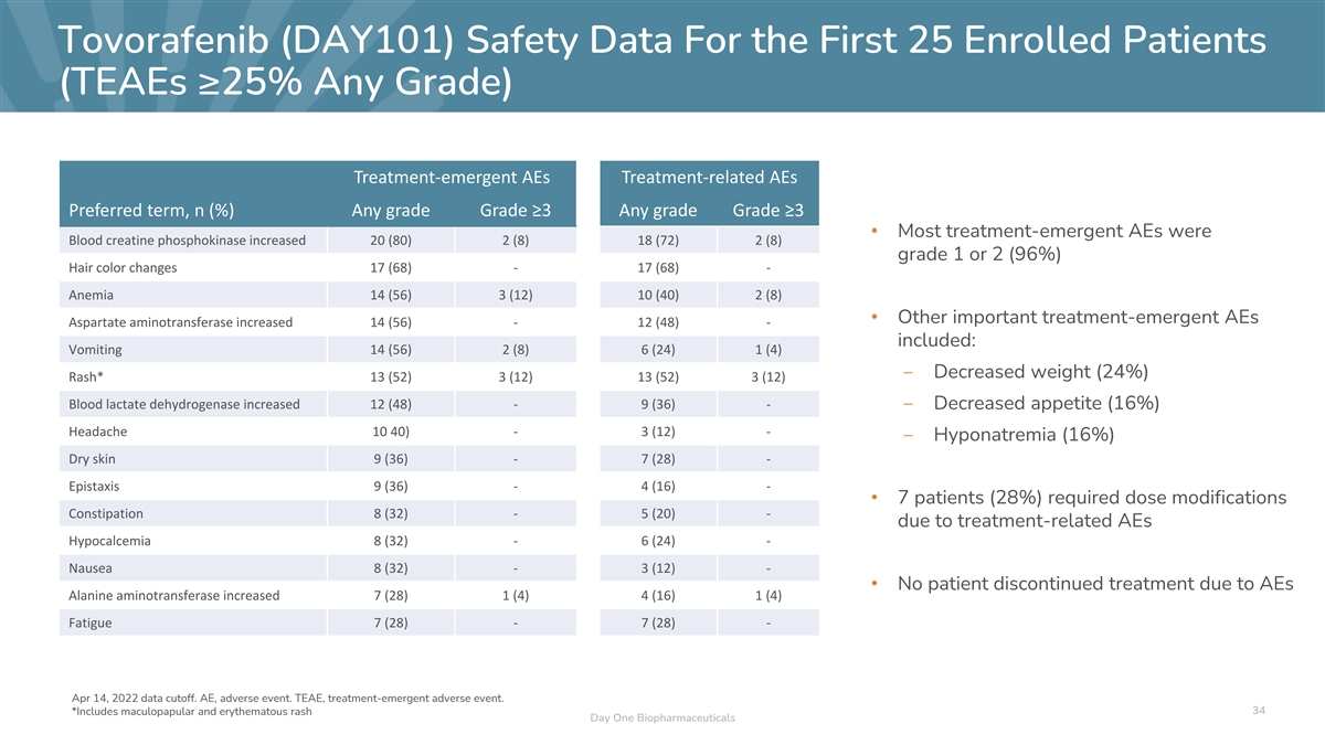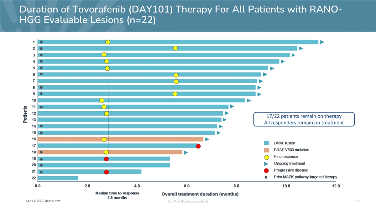 Duration of Tovorafenib (DAY101) Therapy For All Patients with RANO- HGG Evaluable Lesions (n=22) 17/22 patients remain on therapy All responders remain on treatment Apr 14, 2022 data cutoff. Day One Biopharmaceuticals 32