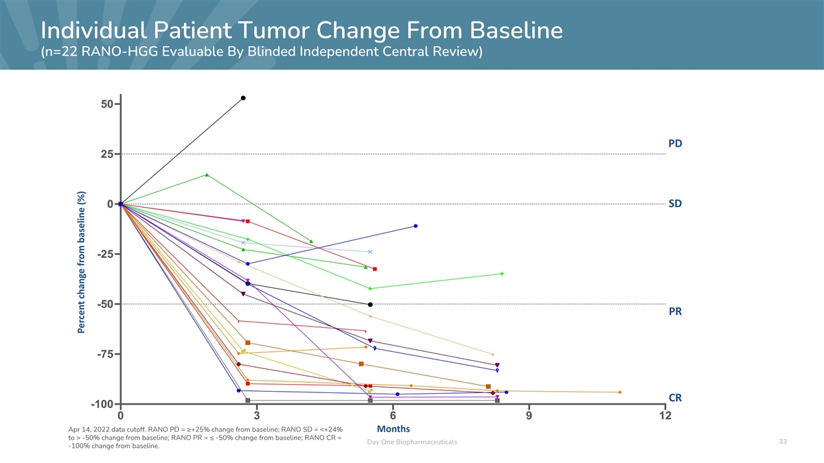 Individual Patient Tumor Change From Baseline (n=22 RANO-HGG Evaluable By Blinded Independent Central Review) PD SD PR CR Apr 14, 2022 data cutoff. RANO PD = ≥+25% change from baseline; RANO SD = <+24% Months to > -50% change from baseline; RANO PR = ≤ -50% change from baseline; RANO CR = Day One Biopharmaceuticals 33 -100% change from baseline. Percent change from baseline (%)
