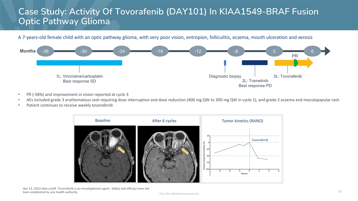Case Study: Activity Of Tovorafenib (DAY101) In KIAA1549-BRAF Fusion Optic Pathway Glioma A 7-years-old female child with an optic pathway glioma, with very poor vision, entropion, folliculitis, eczema, mouth ulceration and xerosis Months -36 -30 -24 -18 -12 -6 0 6 PR 1L: Vincristine/carboplatin Diagnostic biopsy 3L: Tovorafenib 2L: Trametinib Best response SD Best response PD • PR (-58%) and improvement in vision reported at cycle 3 • AEs included grade 3 erythematous rash requiring dose interruption and dose reduction (400 mg QW to 300 mg QW in cycle 1), and grade 2 eczema and maculopapular rash • Patient continues to receive weekly tovorafenib Baseline After 6 cycles Tumor kinetics (RANO) Tovorafenib Apr 14, 2022 data cutoff. Tovorafenib is an investigational agent. Safety and efficacy have not 36 been established by any health authority. Day One Biopharmaceuticals
