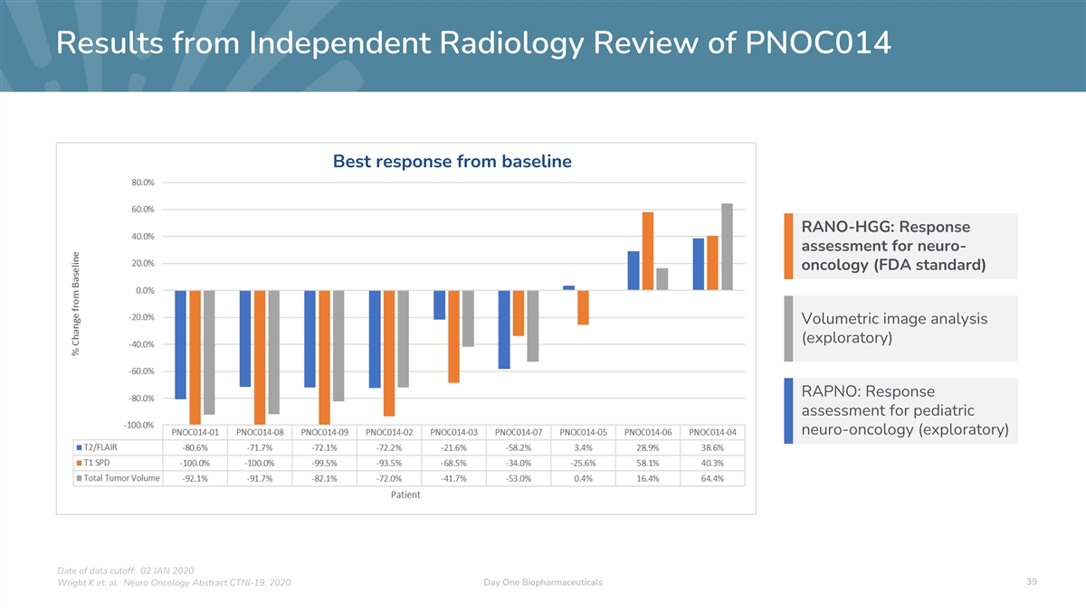 Results from Independent Radiology Review of PNOC014 Best response from baseline RANO-HGG: Response assessment for neuro- oncology (FDA standard) Volumetric image analysis (exploratory) RAPNO: Response assessment for pediatric neuro-oncology (exploratory) Date of data cutoff: 02 JAN 2020 Day One Biopharmaceuticals 39 Wright K et. al. Neuro Oncology Abstract CTNI-19. 2020