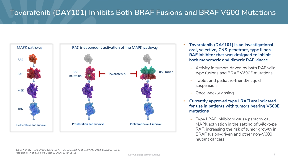 Pediatric Low-Grade Gliomas (pLGG) • Despite being the most common brain tumor in children, there are no approved agents and no standard-of-care for the majority of patients 1,2 with relapsed/progressive disease ‒ ~70% of patients will require systemic therapy ‒ Patients have a high rate of recurrence and are frequently treated with multiple lines of systemic therapy over the course of their disease 3 • The majority of pLGGs are driven by BRAF alterations ‒ ~85% of BRAF-altered tumors harbor a KIAA1549-BRAF gene fusion ‒ ~15% are driven by BRAF V600E mutation • Despite low-grade histology and high long-term survival, pLGGs are 1-4 chronic and relentless ‒ Goal of therapy is to stabilize or shrink tumors while minimizing treatment-associated toxicities from surgery, chemotherapy, and radiation ‒ Many patients today suffer profound tumor and treatment-associated morbidity and significant late effects that persist throughout life 6 y/o with large relapsed BRAF fusion-positive optic pathway glioma 1. Ostrum QT et al., Neuro Oncol. 2015; 16(Suppl 10):x1-x36; 2. De Blank P. et al., Curr Opin Pediatr. 2019 Feb; 31(1):21-27. 3. Jones DTW et al., Cancer Res. 2008; 68:8673–77. 4. Traunwieser T et al., Neurooncol Adv. 2020; 2:vdaa094; Day One Biopharmaceuticals 7