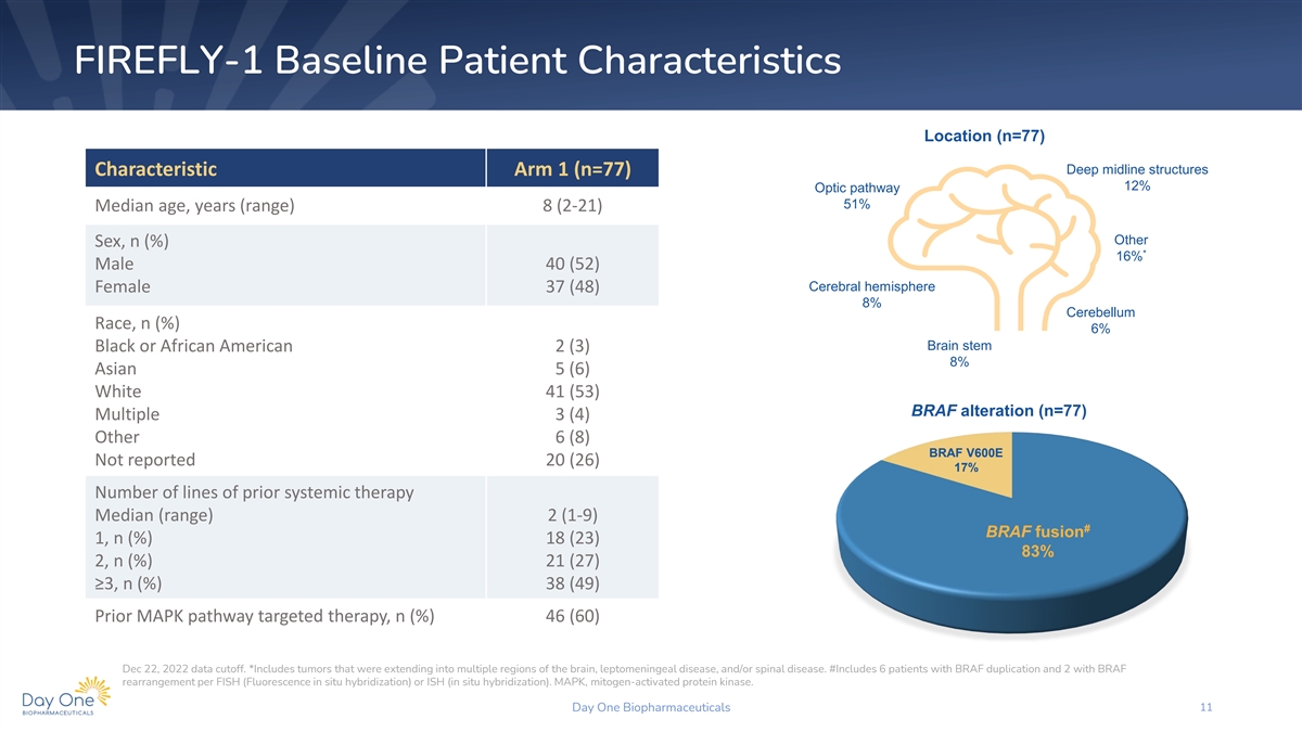 FIREFLY-1 Baseline Patient Characteristics Location (n=77) Deep midline structures Characteristic Arm 1 (n=77) 12% Optic pathway 51% Median age, years (range) 8 (2-21) Other Sex, n (%) * 16% Male 40 (52) Cerebral hemisphere Female 37 (48) 8% Cerebellum Race, n (%) 6% Brain stem Black or African American 2 (3) 8% Asian 5 (6) White 41 (53) BRAF alteration (n=77) Multiple 3 (4) Other 6 (8) BRAF V600E Not reported 20 (26) 17% Number of lines of prior systemic therapy Median (range) 2 (1-9) # BRAF fusion 1, n (%) 18 (23) 83% 2, n (%) 21 (27) ≥3, n (%) 38 (49) Prior MAPK pathway targeted therapy, n (%) 46 (60) Dec 22, 2022 data cutoff. *Includes tumors that were extending into multiple regions of the brain, leptomeningeal disease, and/or spinal disease. #Includes 6 patients with BRAF duplication and 2 with BRAF rearrangement per FISH (Fluorescence in situ hybridization) or ISH (in situ hybridization). MAPK, mitogen-activated protein kinase. Day One Biopharmaceuticals 11