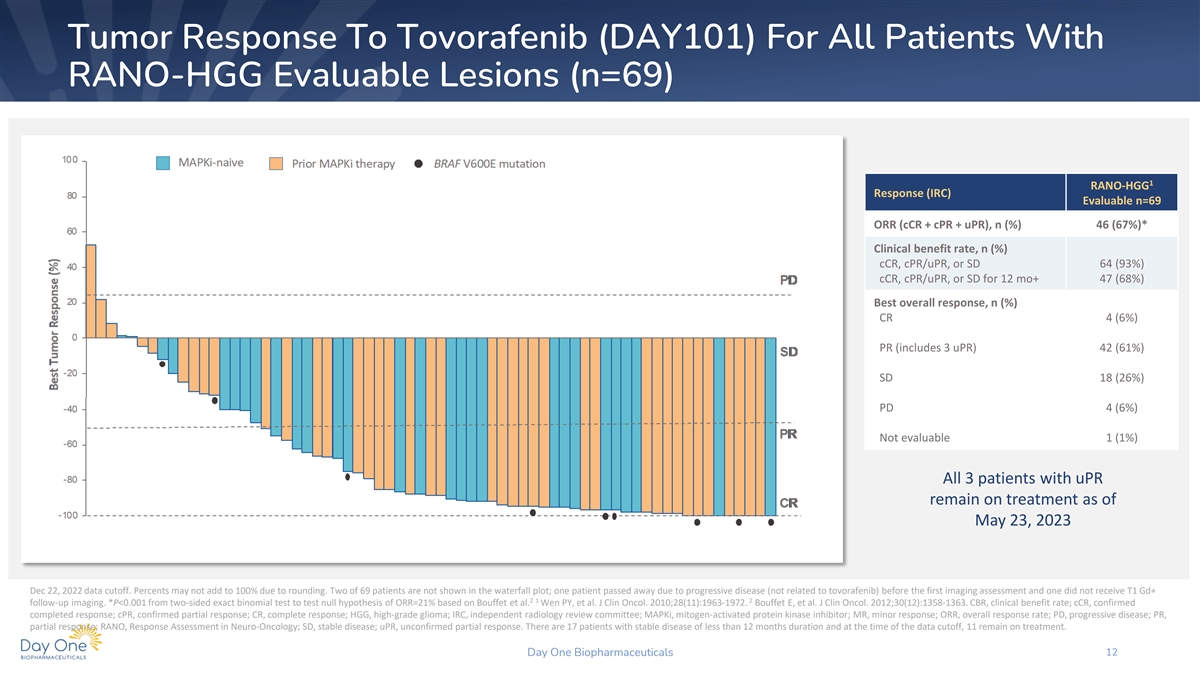 Tumor Response To Tovorafenib (DAY101) For All Patients With RANO-HGG Evaluable Lesions (n=69) 1 RANO-HGG Response (IRC) Evaluable n=69 ORR (cCR + cPR + uPR), n (%) 46 (67%)* Clinical benefit rate, n (%) cCR, cPR/uPR, or SD 64 (93%) cCR, cPR/uPR, or SD for 12 mo+ 47 (68%) Best overall response, n (%) CR 4 (6%) PR (includes 3 uPR) 42 (61%) SD 18 (26%) PD 4 (6%) Not evaluable 1 (1%) All 3 patients with uPR remain on treatment as of May 23, 2023 Dec 22, 2022 data cutoff. Percents may not add to 100% due to rounding. Two of 69 patients are not shown in the waterfall plot; one patient passed away due to progressive disease (not related to tovorafenib) before the first imaging assessment and one did not receive T1 Gd+ 2 1 2 follow-up imaging. *P<0.001 from two-sided exact binomial test to test null hypothesis of ORR=21% based on Bouffet et al. Wen PY, et al. J Clin Oncol. 2010;28(11):1963-1972. Bouffet E, et al. J Clin Oncol. 2012;30(12):1358-1363. CBR, clinical benefit rate; cCR, confirmed completed response; cPR, confirmed partial response; CR, complete response; HGG, high-grade glioma; IRC, independent radiology review committee; MAPKi, mitogen-activated protein kinase inhibitor; MR, minor response; ORR, overall response rate; PD, progressive disease; PR, partial response; RANO, Response Assessment in Neuro-Oncology; SD, stable disease; uPR, unconfirmed partial response. There are 17 patients with stable disease of less than 12 months duration and at the time of the data cutoff, 11 remain on treatment. Day One Biopharmaceuticals 12