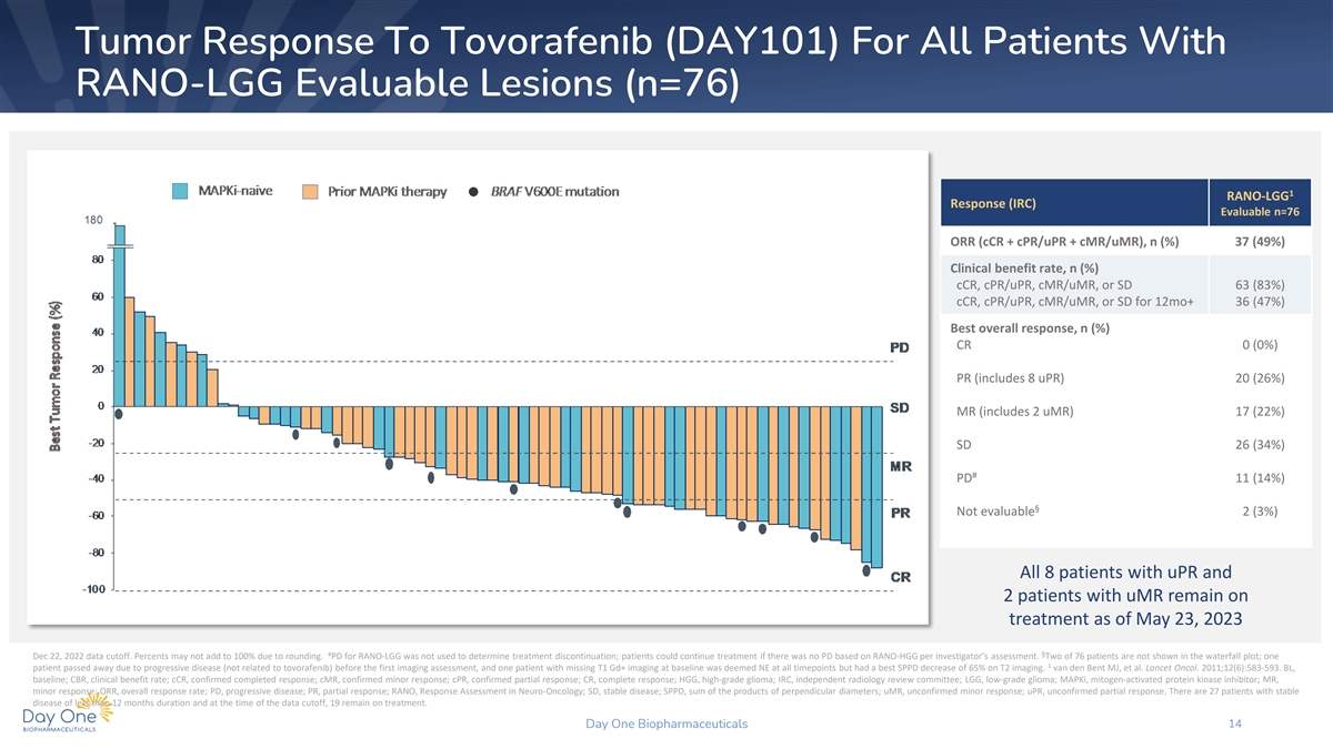 Tumor Response To Tovorafenib (DAY101) For All Patients With RAPNO-LGG Evaluable Lesions (n=69*) 1 RAPNO-LGG Response (IRC) Evaluable n=69 ORR (cCR + cPR/uPR + cMR/uMR), n (%) 35 (51%) Clinical benefit rate, n (%) cCR, cPR/uPR, cMR/uMR, or SD 60 (87%) cCR, cPR/uPR, cMR/uMR, or SD for 12mo+ 32 (46%) Best overall response, n (%) CR 0 (0%) PR (includes 4 uPR) 17 (25%) MR (includes 4 uMR) 18 (26%) SD 25 (36%) # PD 8 (12%) Not evaluable 1 (1%) All 4 patients with uPR and 3 patients with uMR remain on treatment as of May 23, 2023 Dec 22, 2022 data cutoff. Percents may not add to 100% due to rounding. Two of 69 patients not shown in waterfall plot; one patient passed away due to progressive disease (not related to tovorafenib) before the first imaging assessment and one patient had visual progressive disease but no evaluable T2 measurements at 1 # the time of progression. *Pending adjudication. Fangusaro J, et al. Lancet Oncol. 2020;21(6):e305-316. PD for RAPNO-LGG was not used to determine treatment discontinuation; patients could continue treatment if there was no PD based on RANO-HGG per investigator’s assessment. CBR, clinical benefit rate; cCR, confirmed completed response; cMR, confirmed minor respons`e; cPR, confirmed partial response; CR, complete response; HGG, high-grade glioma; IRC, independent radiology review committee; LGG, low-grade glioma; MAPKi, mitogen-activated protein kinase inhibitor; MR, minor response; ORR, overall response rate; PD, progressive disease; PR, partial response; RANO, Response Assessment in Neuro-Oncology; RAPNO, Response Assessment in Pediatric Neuro-Oncology; SD, stable disease; uMR, unconfirmed minor response; uPR, unconfirmed partial response. There are 28 patients with stable disease of less than 12 months duration and at the time of the data cutoff, 11 remain on treatment. Day One Biopharmaceuticals 13
