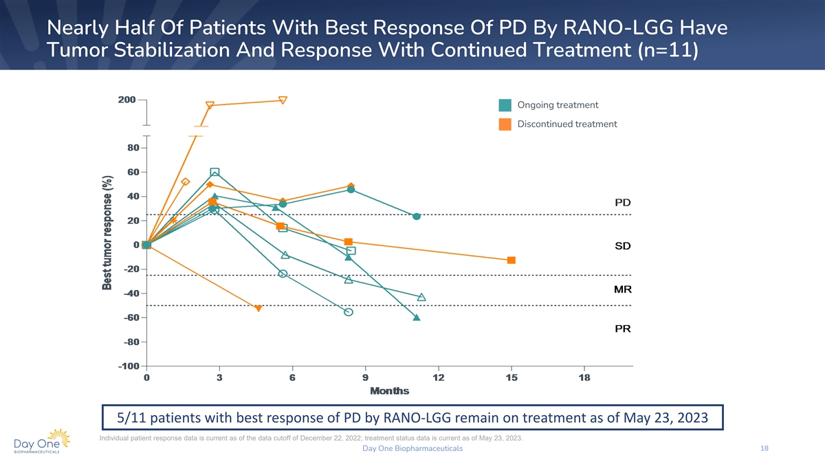 All RANO-LGG Unconfirmed PR Patients Continue On Treatment With Demonstrable Deepening Of Response (n=8) Responses for Patients with Unconfirmed Partial Response by RANO-LGG SD MR PR CR Months from Baseline All 8 patients with unconfirmed partial response by RANO-LGG remain on treatment as of May 23, 2023 Spider plot for SPPD – baseline and after treatment (RANO-LGG by IRC) – unconfirmed PR patients EOT status based on May 23, 2023 EDC data. Individual patient response data is current as of the data cutoff of December 22, 2022; treatment status data is current as of May 23, 2023. Day One Biopharmaceuticals 17 Percent Change from Baseline (%)