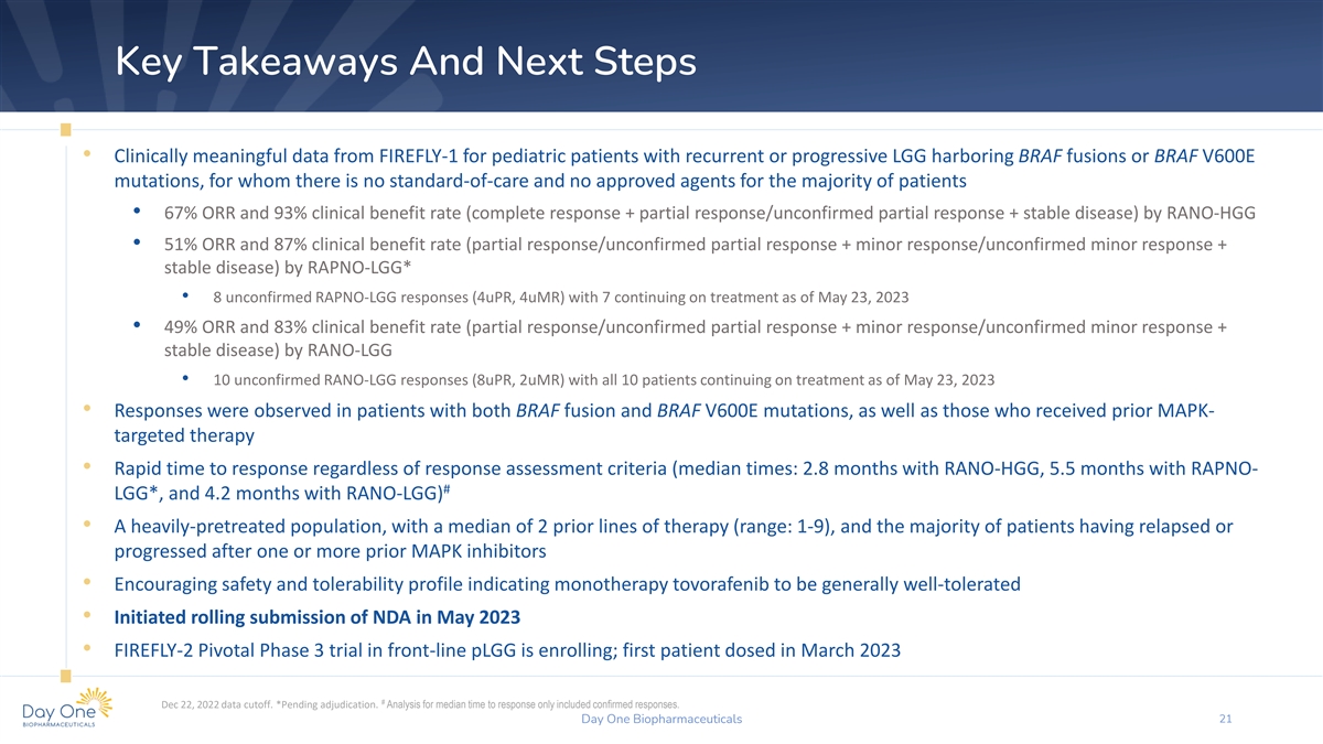 Case Study: Activity Of Tovorafenib (DAY101) In KIAA1549-BRAF Fusion Optic Pathway Glioma 8-year-old boy with relapsed pilomyxoid astrocytoma of the optic pathway, with visual loss in right eye, visual field loss in left eye, fatigue, intermittent nausea/vomiting, intermittent headaches, anorexia, and temperature regulation disorder Months -60 0 12 -48 -36 -12 24 -24 Trametinib VC Binimetinib Tovorafenib PR • Initiated treatment with tovorafenib 400 mg/QW following 3 prior therapies, including binimetinib and trametinib, which were discontinued due to PD • At cycle 3, PR (-88%) per RANO-HGG, and MR (-32% and -40%) per RAPNO-LGG and RANO-LGG, respectively − Sustained improvements in visual acuity reported; logMAR change 0.2 → 0 − PD criteria met (-94% to -91%) with RANO-HGG at cycle 15; continued treatment as investigator deemed no radiographic progression with subsequent reduction in target lesion (-97%) • AEs were G2 (drug eruption, elevated CPK) and G1 (hair color change, paronychia, growth retardation) T1 + C (baseline and post-cycle 3) T2 (baseline and post-cycles 3 & 12) Tumor kinetics Dec 22, 2022, data cut-off. AEs, adverse events; C, contrast; CPK, creatine phosphokinase; G, grade; HGG, high-grade glioma; LGG, low-grade glioma; logMAR, Logarithm of the Minimum Angle of Resolution; MR, minor response; PD, progressive disease; PR, partial response; QW, once weekly; RANO, Response Assessment in Neuro-Oncology; RAPNO, Response Assessment in Pediatric Neuro-Oncology; VC, vincristine-carboplatin.. Day One Biopharmaceuticals 20