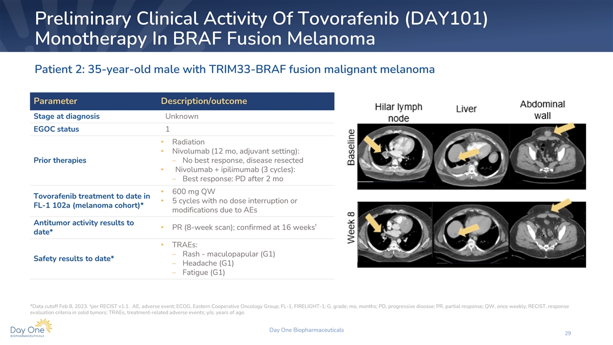 Preliminary Clinical Activity Of Tovorafenib (DAY101) Monotherapy In BRAF Fusion Melanoma Patient 1: 53-year-old male with AGK-BRAF fusion non-spitzoid cutaneous melanoma Parameter Description/outcome Stage at diagnosis III EGOC status 0 • Multiple lymphadenectomies and skin lesion excision surgery Prior therapies • Pembrolizumab (11 weeks): ‒ Best response: SD • 600 mg QW Tovorafenib treatment to date in • 5 cycles with no dose interruption or modifications FL-1 102a (melanoma cohort)* due to AEs † ‡ Antitumor activity results to date* • CR (11-week scan) ; confirmed at 16 weeks • TRAEs: ‒ Transient rash (G1 and G2) Safety results to date* ‒ Anemia (G2) • TEAE: ‒ Neck pain (G1) *Data cutoff Feb 8, 2023. †Out of window per protocol. ‡per RECIST v1.1. AE, adverse event; CR, complete response; ECOG, Eastern Cooperative Oncology Group; FL-1, FIRELIGHT-1; G, grade; QW, once weekly; RECIST, response evaluation criteria in solid tumors; SD, stable disease; TEAE, treatment-emergent adverse event; TRAEs, treatment-related adverse events; y/o, years of age. Day One Biopharmaceuticals 28