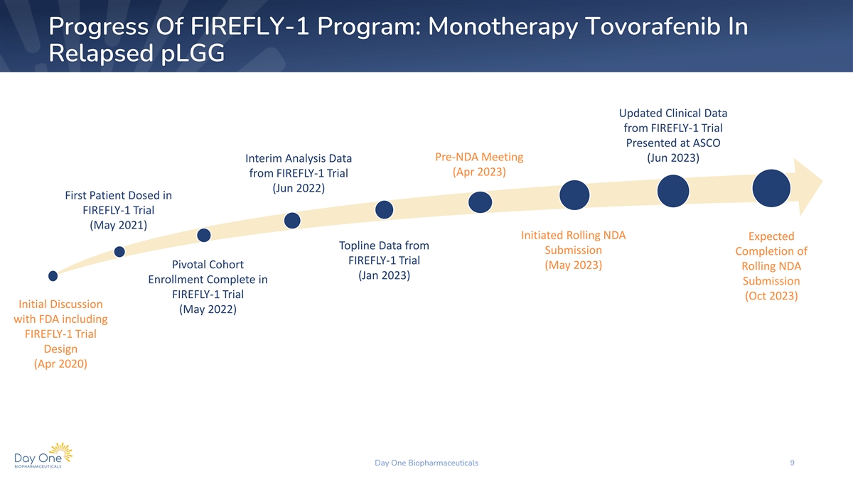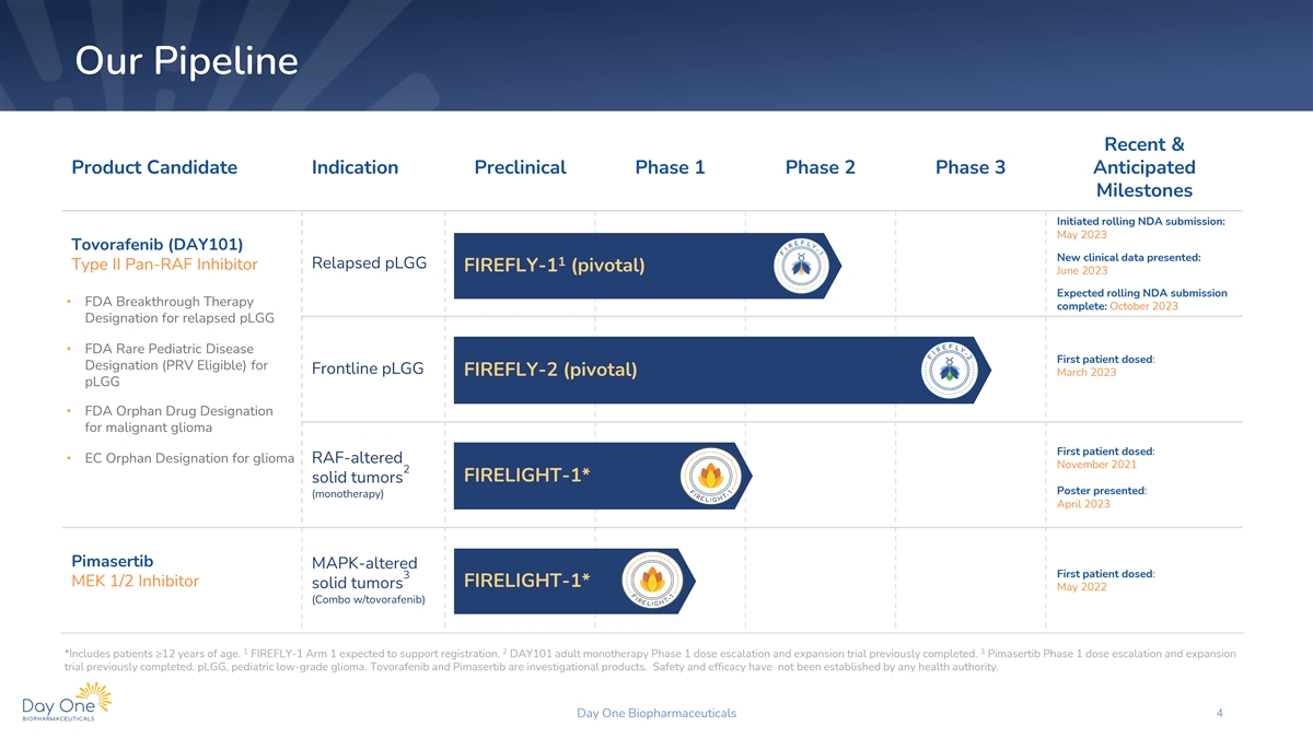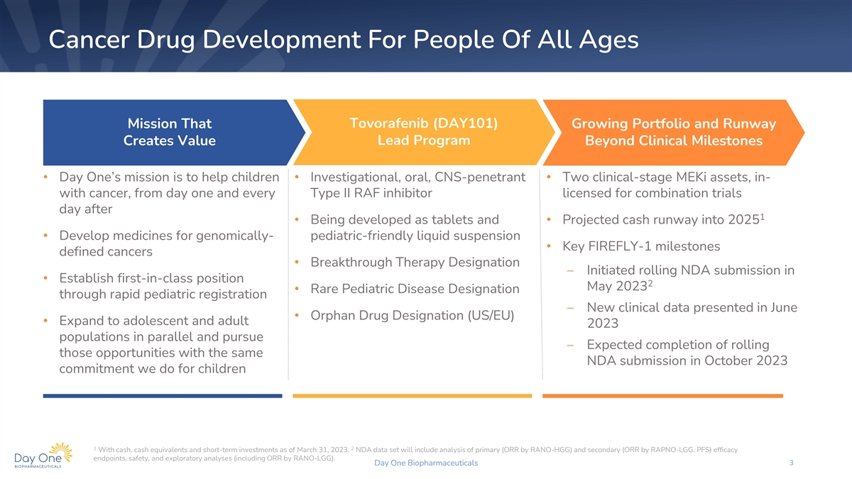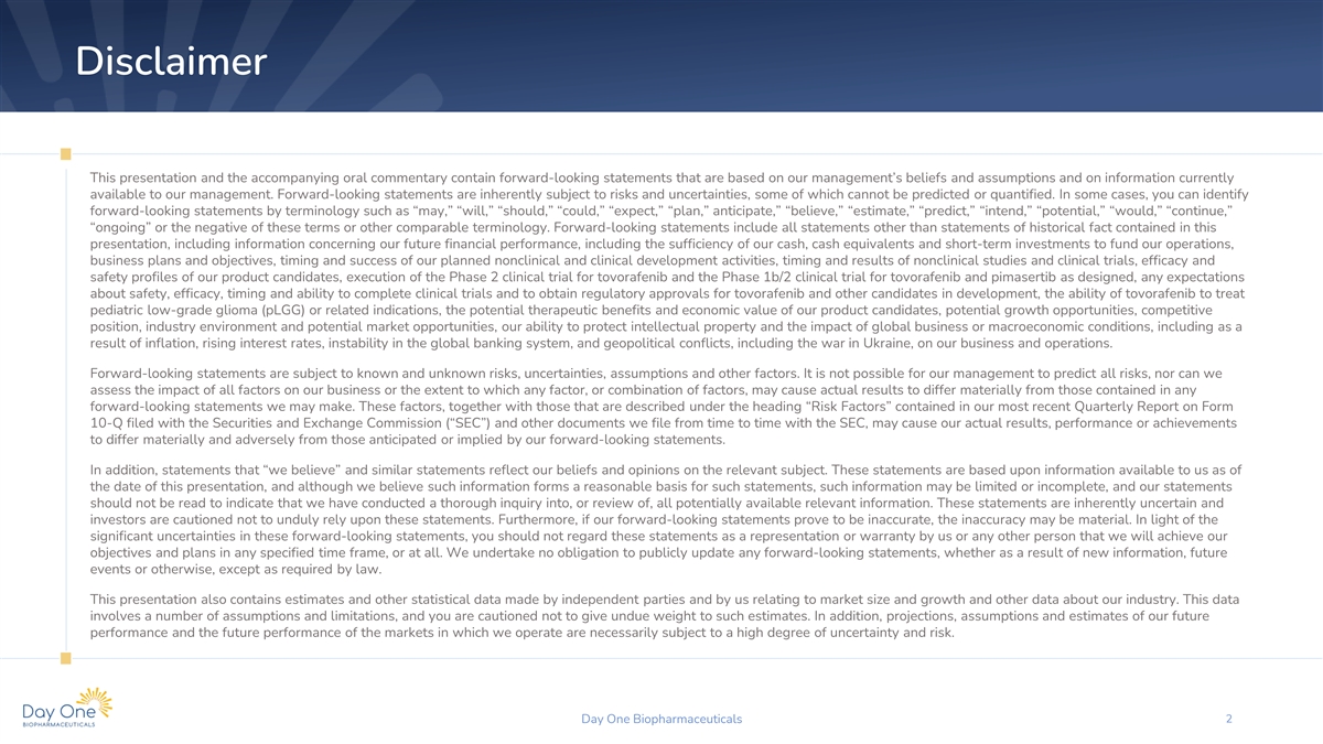 Disclaimer This presentation and the accompanying oral commentary contain forward-looking statements that are based on our management’s beliefs and assumptions and on information currently available to our management. Forward-looking statements are inherently subject to risks and uncertainties, some of which cannot be predicted or quantified. In some cases, you can identify forward-looking statements by terminology such as “may,” “will,” “should,” “could,” “expect,” “plan,” anticipate,” “believe,” “estimate,” “predict,” “intend,” “potential,” “would,” “continue,” “ongoing” or the negative of these terms or other comparable terminology. Forward-looking statements include all statements other than statements of historical fact contained in this presentation, including information concerning our future financial performance, including the sufficiency of our cash, cash equivalents and short-term investments to fund our operations, business plans and objectives, timing and success of our planned nonclinical and clinical development activities, timing and results of nonclinical studies and clinical trials, efficacy and safety profiles of our product candidates, execution of the Phase 2 clinical trial for tovorafenib and the Phase 1b/2 clinical trial for tovorafenib and pimasertib as designed, any expectations about safety, efficacy, timing and ability to complete clinical trials and to obtain regulatory approvals for tovorafenib and other candidates in development, the ability of tovorafenib to treat pediatric low-grade glioma (pLGG) or related indications, the potential therapeutic benefits and economic value of our product candidates, potential growth opportunities, competitive position, industry environment and potential market opportunities, our ability to protect intellectual property and the impact of global business or macroeconomic conditions, including as a result of inflation, rising interest rates, instability in the global banking system, and geopolitical conflicts, including the war in Ukraine, on our business and operations. Forward-looking statements are subject to known and unknown risks, uncertainties, assumptions and other factors. It is not possible for our management to predict all risks, nor can we assess the impact of all factors on our business or the extent to which any factor, or combination of factors, may cause actual results to differ materially from those contained in any forward-looking statements we may make. These factors, together with those that are described under the heading “Risk Factors” contained in our most recent Quarterly Report on Form 10-Q filed with the Securities and Exchange Commission (“SEC”) and other documents we file from time to time with the SEC, may cause our actual results, performance or achievements to differ materially and adversely from those anticipated or implied by our forward-looking statements. In addition, statements that “we believe” and similar statements reflect our beliefs and opinions on the relevant subject. These statements are based upon information available to us as of the date of this presentation, and although we believe such information forms a reasonable basis for such statements, such information may be limited or incomplete, and our statements should not be read to indicate that we have conducted a thorough inquiry into, or review of, all potentially available relevant information. These statements are inherently uncertain and investors are cautioned not to unduly rely upon these statements. Furthermore, if our forward-looking statements prove to be inaccurate, the inaccuracy may be material. In light of the significant uncertainties in these forward-looking statements, you should not regard these statements as a representation or warranty by us or any other person that we will achieve our objectives and plans in any specified time frame, or at all. We undertake no obligation to publicly update any forward-looking statements, whether as a result of new information, future events or otherwise, except as required by law. This presentation also contains estimates and other statistical data made by independent parties and by us relating to market size and growth and other data about our industry. This data involves a number of assumptions and limitations, and you are cautioned not to give undue weight to such estimates. In addition, projections, assumptions and estimates of our future performance and the future performance of the markets in which we operate are necessarily subject to a high degree of uncertainty and risk. Day One Biopharmaceuticals 2