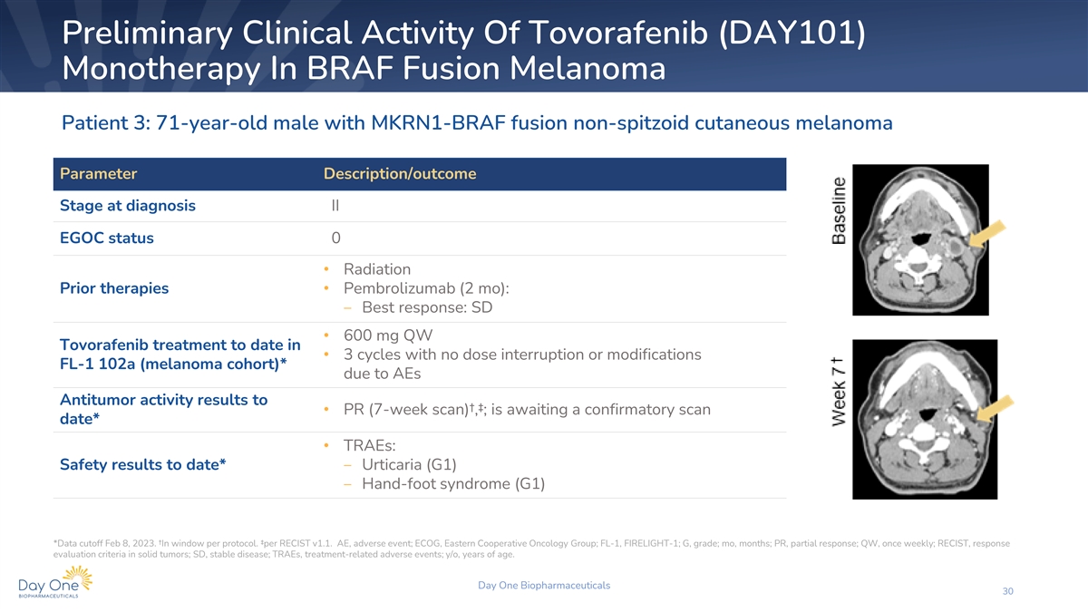 Preliminary Clinical Activity Of Tovorafenib (DAY101) Monotherapy In BRAF Fusion Melanoma Patient 2: 35-year-old male with TRIM33-BRAF fusion malignant melanoma Parameter Description/outcome Stage at diagnosis Unknown EGOC status 1 • Radiation • Nivolumab (12 mo, adjuvant setting): Prior therapies ‒ No best response, disease resected • Nivolumab + ipilimumab (3 cycles): ‒ Best response: PD after 2 mo • 600 mg QW Tovorafenib treatment to date in • 5 cycles with no dose interruption or FL-1 102a (melanoma cohort)* modifications due to AEs Antitumor activity results to † • PR (8-week scan); confirmed at 16 weeks date* • TRAEs: ‒ Rash - maculopapular (G1) Safety results to date* ‒ Headache (G1) ‒ Fatigue (G1) *Data cutoff Feb 8, 2023. †per RECIST v1.1. AE, adverse event; ECOG, Eastern Cooperative Oncology Group; FL-1, FIRELIGHT-1; G, grade; mo, months; PD, progressive disease; PR, partial response; QW, once weekly; RECIST, response evaluation criteria in solid tumors; TRAEs, treatment-related adverse events; y/o, years of age. Day One Biopharmaceuticals 29