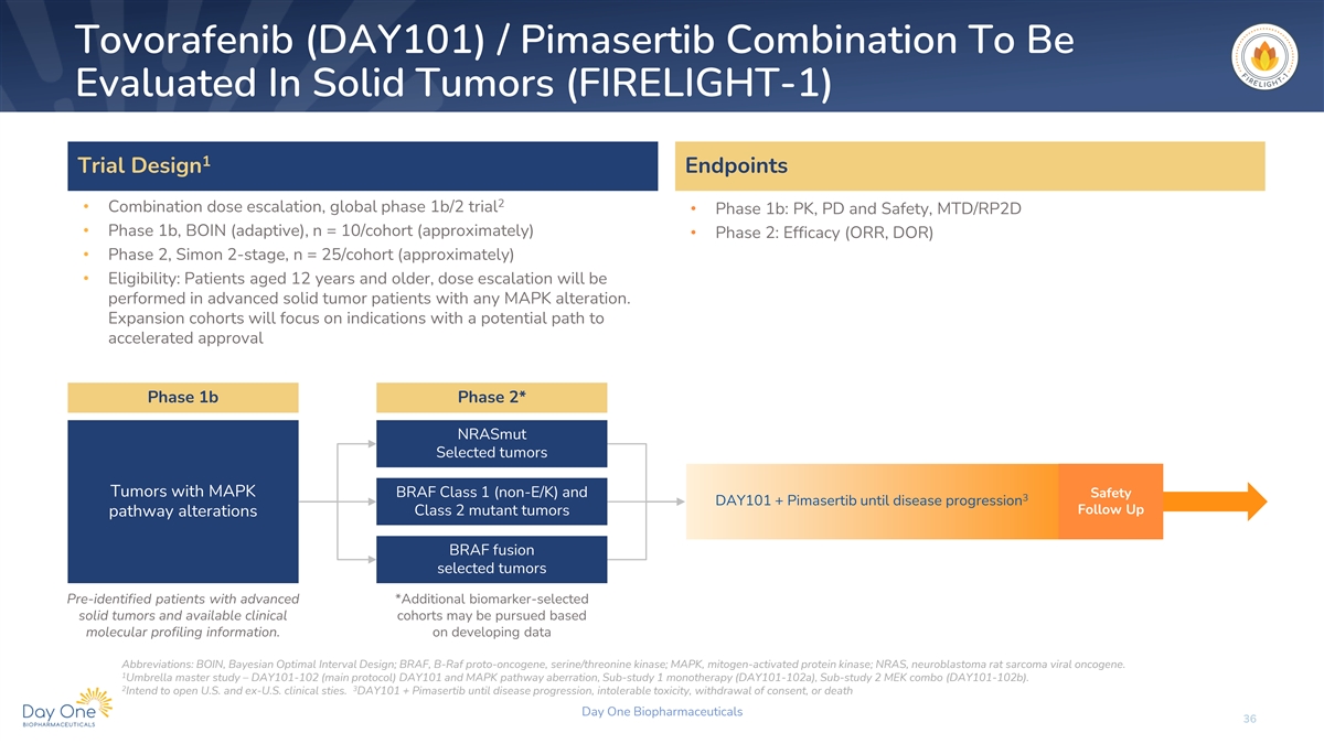 Tovorafenib (DAY101) / Pimasertib Combination To Be Evaluated In Solid Tumors (FIRELIGHT-1) 1 Trial Design Endpoints 2 • Combination dose escalation, global phase 1b/2 trial • Phase 1b: PK, PD and Safety, MTD/RP2D • Phase 1b, BOIN (adaptive), n = 10/cohort (approximately) • Phase 2: Efficacy (ORR, DOR) • Phase 2, Simon 2-stage, n = 25/cohort (approximately) • Eligibility: Patients aged 12 years and older, dose escalation will be performed in advanced solid tumor patients with any MAPK alteration. Expansion cohorts will focus on indications with a potential path to accelerated approval Phase 1b Phase 2* NRASmut Selected tumors Tumors with MAPK BRAF Class 1 (non-E/K) and Safety 3 DAY101 + Pimasertib until disease progression Follow Up Class 2 mutant tumors pathway alterations BRAF fusion selected tumors Pre-identified patients with advanced *Additional biomarker-selected solid tumors and available clinical cohorts may be pursued based molecular profiling information. on developing data Abbreviations: BOIN, Bayesian Optimal Interval Design; BRAF, B-Raf proto-oncogene, serine/threonine kinase; MAPK, mitogen-activated protein kinase; NRAS, neuroblastoma rat sarcoma viral oncogene. 1 Umbrella master study – DAY101-102 (main protocol) DAY101 and MAPK pathway aberration, Sub-study 1 monotherapy (DAY101-102a), Sub-study 2 MEK combo (DAY101-102b). 2 3 Intend to open U.S. and ex-U.S. clinical sties. DAY101 + Pimasertib until disease progression, intolerable toxicity, withdrawal of consent, or death Day One Biopharmaceuticals 36
