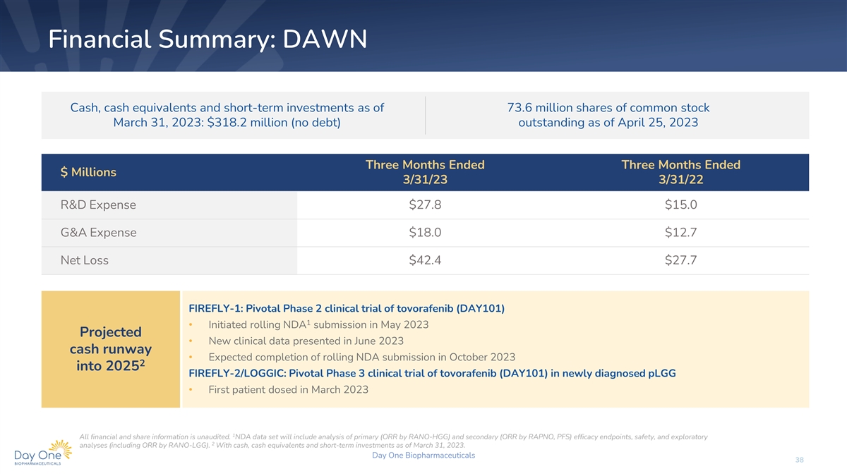 Financial Summary: DAWN Cash, cash equivalents and short-term investments as of 73.6 million shares of common stock March 31, 2023: $318.2 million (no debt) outstanding as of April 25, 2023 Three Months Ended Three Months Ended $ Millions 3/31/23 3/31/22 R&D Expense $27.8 $15.0 G&A Expense $18.0 $12.7 Net Loss $42.4 $27.7 FIREFLY-1: Pivotal Phase 2 clinical trial of tovorafenib (DAY101) 1 • Initiated rolling NDA submission in May 2023 Projected • New clinical data presented in June 2023 cash runway • Expected completion of rolling NDA submission in October 2023 2 into 2025 FIREFLY-2/LOGGIC: Pivotal Phase 3 clinical trial of tovorafenib (DAY101) in newly diagnosed pLGG • First patient dosed in March 2023 1 All financial and share information is unaudited. NDA data set will include analysis of primary (ORR by RANO-HGG) and secondary (ORR by RAPNO, PFS) efficacy endpoints, safety, and exploratory 2 analyses (including ORR by RANO-LGG). With cash, cash equivalents and short-term investments as of March 31, 2023. Day One Biopharmaceuticals 38