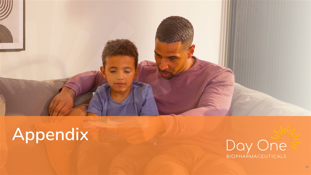 Next Steps FIREFLY-1 • Initiated rolling NDA submission in May 2023 • New clinical data presented in June 2023 • Expected completion of rolling NDA submission in October 2023 FIREFLY-2 • Advance tovorafenib as a front-line therapy for patients newly diagnosed with pLGG FIRELIGHT-1 • Evaluate tovorafenib in combination and as monotherapy in adolescent and adult populations • Monotherapy abstract presented at EADO in April 2023 Commercial • Continue investment in market and launch preparation activities Business Development • Further investment in business development activities to expand our multiple asset portfolio Day One Biopharmaceuticals 39