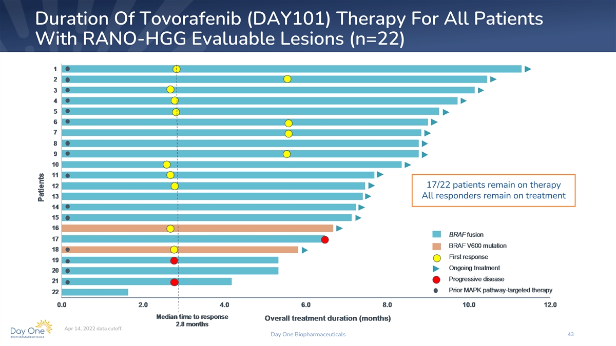 Duration Of Tovorafenib (DAY101) Therapy For All Patients With RANO-HGG Evaluable Lesions (n=22) 17/22 patients remain on therapy All responders remain on treatment Apr 14, 2022 data cutoff. Day One Biopharmaceuticals 43