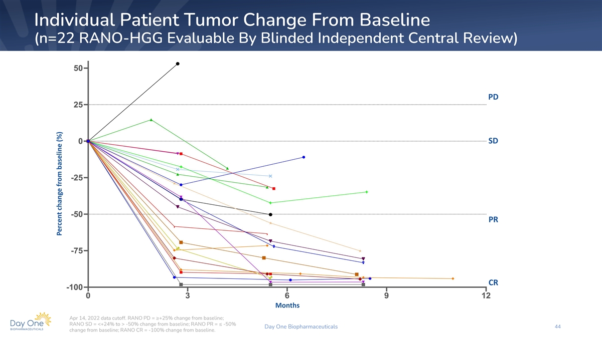 Individual Patient Tumor Change From Baseline (n=22 RANO-HGG Evaluable By Blinded Independent Central Review) PD SD PR CR Months Apr 14, 2022 data cutoff. RANO PD = ≥+25% change from baseline; RANO SD = <+24% to > -50% change from baseline; RANO PR = ≤ -50% Day One Biopharmaceuticals 44 change from baseline; RANO CR = -100% change from baseline. Percent change from baseline (%)