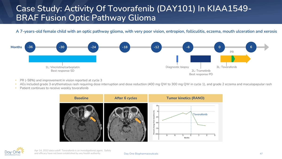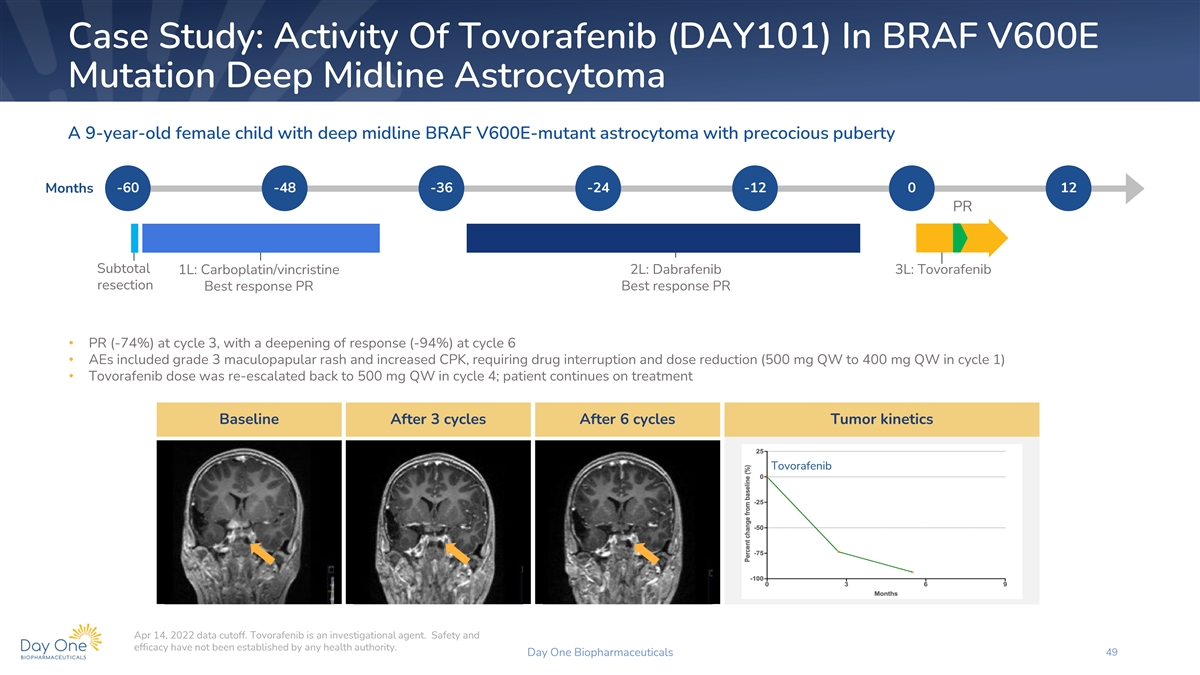 Case Study: Activity Of Tovorafenib (DAY101) In KIAA1549-BRAF Fusion Posterior Fossa Pilocytic Astrocytoma An 8-years-old female child with a posterior fossa pilocytic astrocytoma, eczema, nausea and constipation Months -84 -72 -60 -48 -36 -24 -12 0 12 PR Suboccipital 2L: Carboplatin/vincristine craniotomies 4L: Trametinib 5L: Tovorafenib Best response PR Best response SD 1L: Carboplatin 3L: Vinblastine Best response PD Best response SD • PR (-69%) at cycle 3 with 500 mg QW tovorafenib, with a deepening of response (80% and 91% in cycles 6 and 9, respectively) over time • AEs included grade 2 decrease in neutrophil count, pustular rash, and upper respiratory infection • Patient continues to receive weekly tovorafenib Baseline After 3 cycles After 6 cycles After 9 cycles Tumor kinetics Tovorafenib Apr 14, 2022 data cutoff. Tovorafenib is an investigational agent. Safety and efficacy have not been established by any health authority. Day One Biopharmaceuticals 48