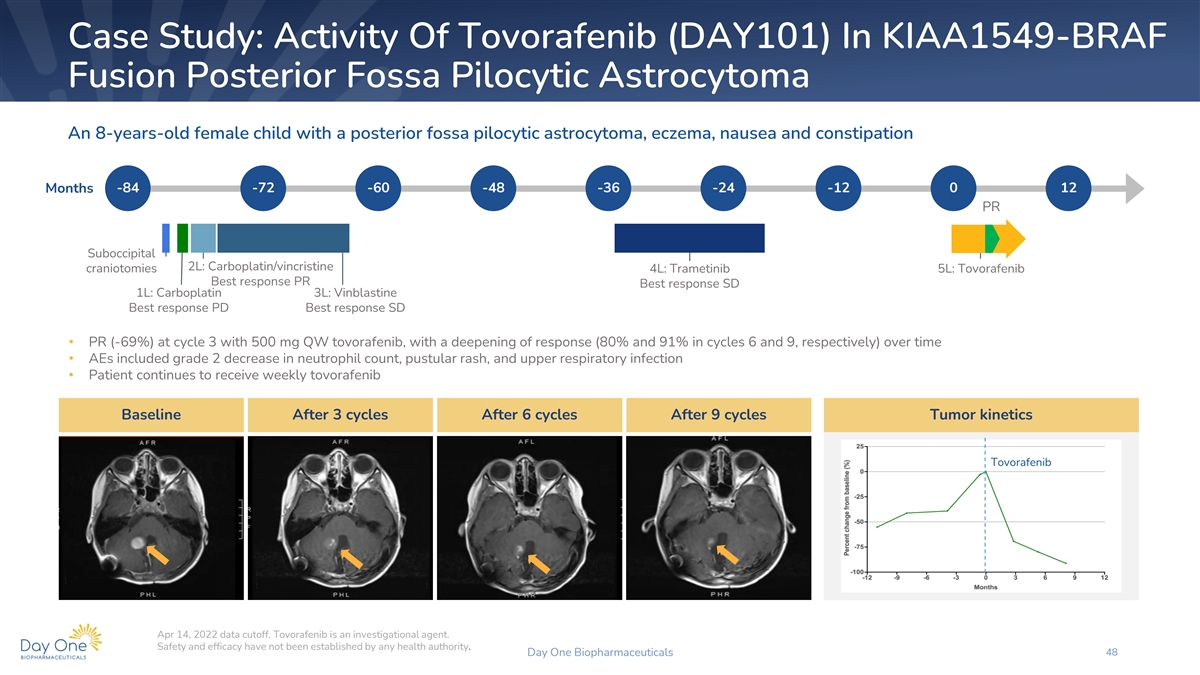 Case Study: Activity Of Tovorafenib (DAY101) In KIAA1549- BRAF Fusion Optic Pathway Glioma A 7-years-old female child with an optic pathway glioma, with very poor vision, entropion, folliculitis, eczema, mouth ulceration and xerosis -36 6 Months -30 -24 -18 -12 -6 0 PR Diagnostic biopsy 3L: Tovorafenib 1L: Vincristine/carboplatin Best response SD 2L: Trametinib Best response PD • PR (-58%) and improvement in vision reported at cycle 3 • AEs included grade 3 erythematous rash requiring dose interruption and dose reduction (400 mg QW to 300 mg QW in cycle 1), and grade 2 eczema and maculopapular rash • Patient continues to receive weekly tovorafenib Baseline After 6 cycles Tumor kinetics (RANO) Tovorafenib Apr 14, 2022 data cutoff. Tovorafenib is an investigational agent. Safety and efficacy have not been established by any health authority. Day One Biopharmaceuticals 47