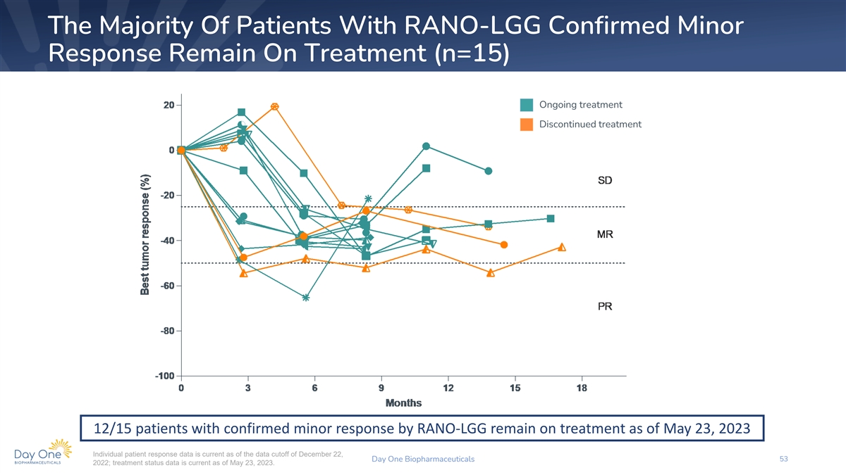 The Majority Of Patients With RANO-LGG Confirmed Minor Response Remain On Treatment (n=15) Ongoing treatment Discontinued treatment 12/15 patients with confirmed minor response by RANO-LGG remain on treatment as of May 23, 2023 Individual patient response data is current as of the data cutoff of December 22, Day One Biopharmaceuticals 53 2022; treatment status data is current as of May 23, 2023.