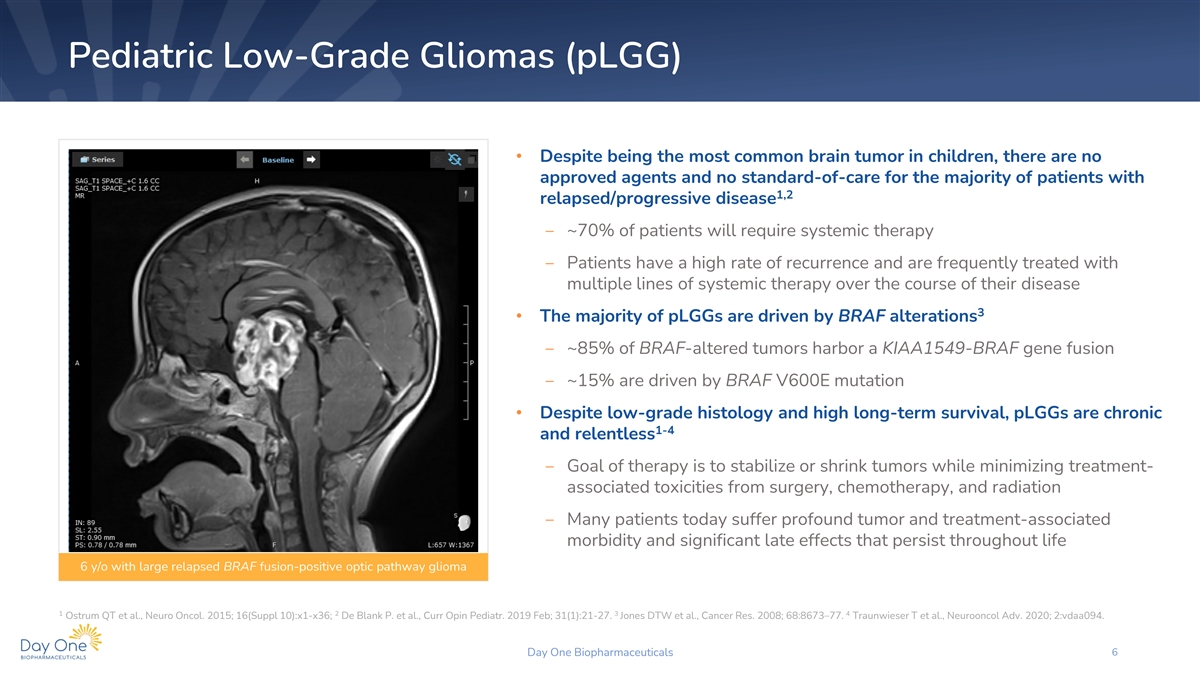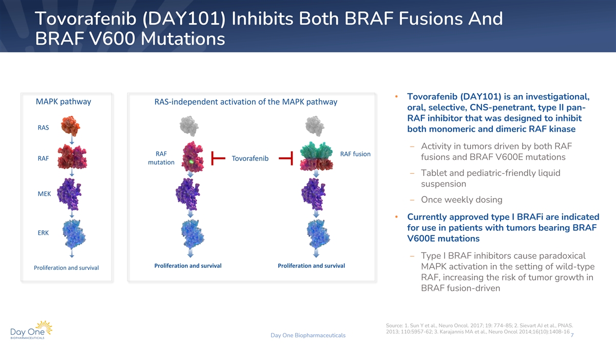 Pediatric Low-Grade Gliomas (pLGG) • Despite being the most common brain tumor in children, there are no approved agents and no standard-of-care for the majority of patients with 1,2 relapsed/progressive disease ‒ ~70% of patients will require systemic therapy ‒ Patients have a high rate of recurrence and are frequently treated with multiple lines of systemic therapy over the course of their disease 3 • The majority of pLGGs are driven by BRAF alterations ‒ ~85% of BRAF-altered tumors harbor a KIAA1549-BRAF gene fusion ‒ ~15% are driven by BRAF V600E mutation • Despite low-grade histology and high long-term survival, pLGGs are chronic 1-4 and relentless ‒ Goal of therapy is to stabilize or shrink tumors while minimizing treatment- associated toxicities from surgery, chemotherapy, and radiation ‒ Many patients today suffer profound tumor and treatment-associated morbidity and significant late effects that persist throughout life 6 y/o with large relapsed BRAF fusion-positive optic pathway glioma 1 2 3 4 Ostrum QT et al., Neuro Oncol. 2015; 16(Suppl 10):x1-x36; De Blank P. et al., Curr Opin Pediatr. 2019 Feb; 31(1):21-27. Jones DTW et al., Cancer Res. 2008; 68:8673–77. Traunwieser T et al., Neurooncol Adv. 2020; 2:vdaa094. Day One Biopharmaceuticals 6