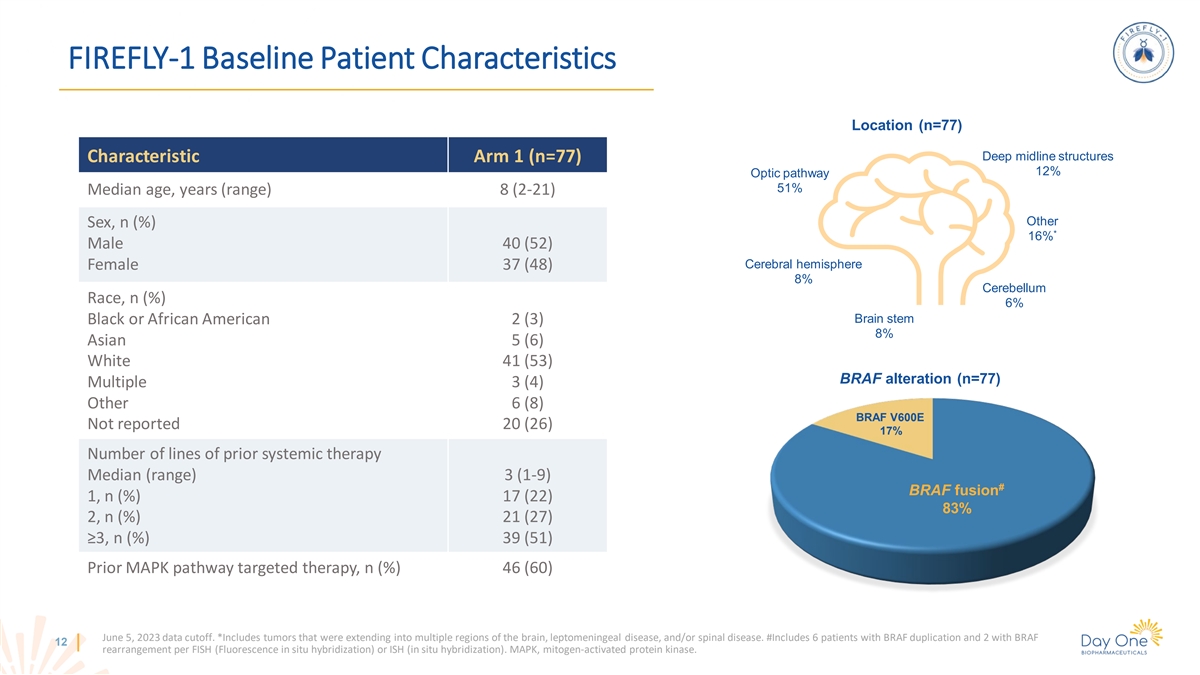 FIREFLY-1 Baseline Patient Characteristics Location (n=77) Deep midline structures Characteristic Arm 1 (n=77) 12% Optic pathway 51% Median age, years (range) 8 (2-21) Other Sex, n (%) * 16% Male 40 (52) Cerebral hemisphere Female 37 (48) 8% Cerebellum Race, n (%) 6% Brain stem Black or African American 2 (3) 8% Asian 5 (6) White 41 (53) BRAF alteration (n=77) Multiple 3 (4) Other 6 (8) BRAF V600E Not reported 20 (26) 17% Number of lines of prior systemic therapy Median (range) 3 (1-9) # BRAF fusion 1, n (%) 17 (22) 83% 2, n (%) 21 (27) ≥3, n (%) 39 (51) Prior MAPK pathway targeted therapy, n (%) 46 (60) June 5, 2023 data cutoff. *Includes tumors that were extending into multiple regions of the brain, leptomeningeal disease, and/or spinal disease. #Includes 6 patients with BRAF duplication and 2 with BRAF 12 rearrangement per FISH (Fluorescence in situ hybridization) or ISH (in situ hybridization). MAPK, mitogen-activated protein kinase.