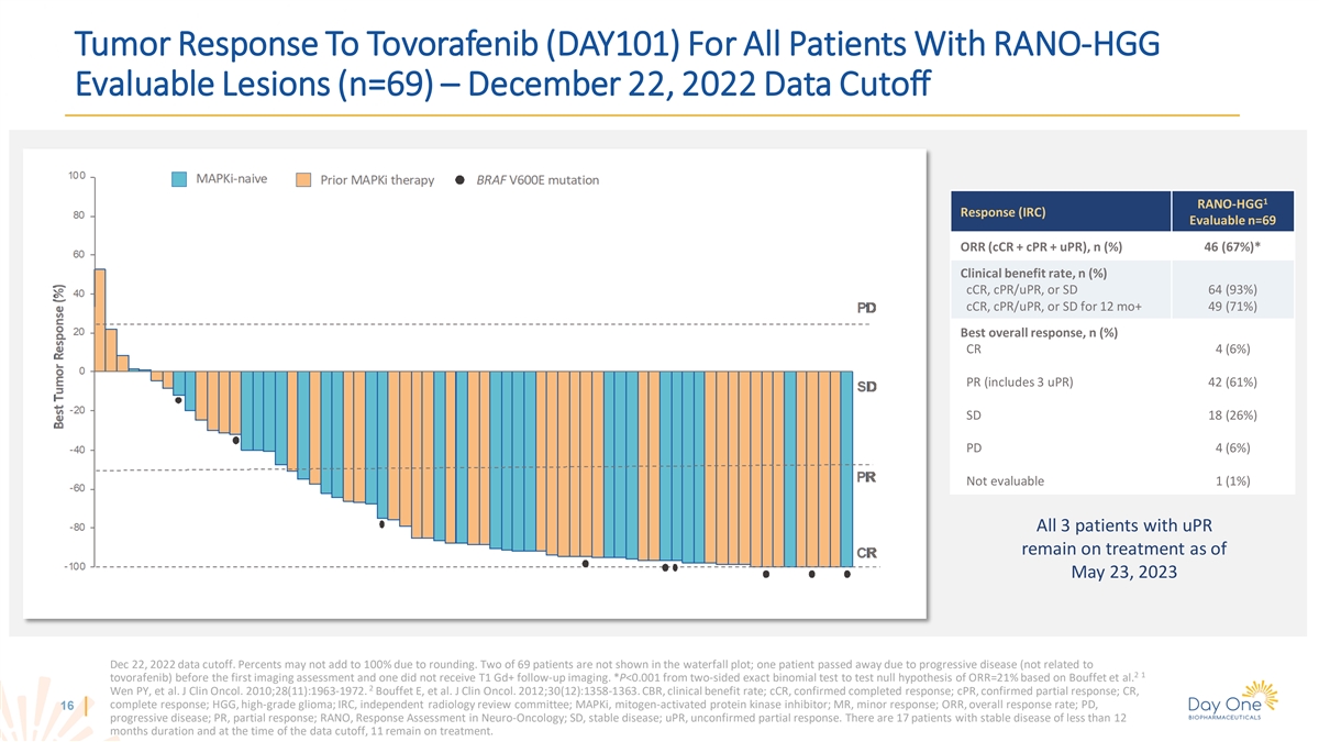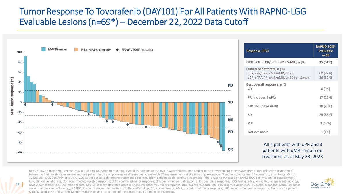 Tumor Response To Tovorafenib (DAY101) For All Patients With RANO-HGG Evaluable Lesions (n=69) – December 22, 2022 Data Cutoff 1 RANO-HGG Response (IRC) Evaluable n=69 ORR (cCR + cPR + uPR), n (%) 46 (67%)* Clinical benefit rate, n (%) cCR, cPR/uPR, or SD 64 (93%) cCR, cPR/uPR, or SD for 12 mo+ 49 (71%) Best overall response, n (%) CR 4 (6%) PR (includes 3 uPR) 42 (61%) SD 18 (26%) PD 4 (6%) Not evaluable 1 (1%) All 3 patients with uPR remain on treatment as of May 23, 2023 Dec 22, 2022 data cutoff. Percents may not add to 100% due to rounding. Two of 69 patients are not shown in the waterfall plot; one patient passed away due to progressive disease (not related to 2 1 tovorafenib) before the first imaging assessment and one did not receive T1 Gd+ follow-up imaging. *P<0.001 from two-sided exact binomial test to test null hypothesis of ORR=21% based on Bouffet et al. 2 Wen PY, et al. J Clin Oncol. 2010;28(11):1963-1972. Bouffet E, et al. J Clin Oncol. 2012;30(12):1358-1363. CBR, clinical benefit rate; cCR, confirmed completed response; cPR, confirmed partial response; CR, complete response; HGG, high-grade glioma; IRC, independent radiology review committee; MAPKi, mitogen-activated protein kinase inhibitor; MR, minor response; ORR, overall response rate; PD, 16 progressive disease; PR, partial response; RANO, Response Assessment in Neuro-Oncology; SD, stable disease; uPR, unconfirmed partial response. There are 17 patients with stable disease of less than 12 months duration and at the time of the data cutoff, 11 remain on treatment.
