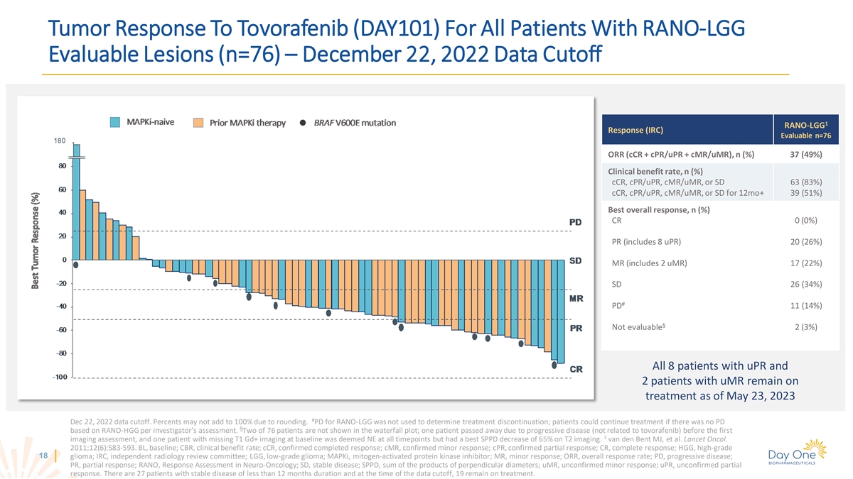Tumor Response To Tovorafenib (DAY101) For All Patients With RANO-LGG Evaluable Lesions (n=76) – December 22, 2022 Data Cutoff 1 RANO-LGG Response (IRC) Evaluable n=76 ORR (cCR + cPR/uPR + cMR/uMR), n (%) 37 (49%) Clinical benefit rate, n (%) cCR, cPR/uPR, cMR/uMR, or SD 63 (83%) cCR, cPR/uPR, cMR/uMR, or SD for 12mo+ 39 (51%) Best overall response, n (%) CR 0 (0%) PR (includes 8 uPR) 20 (26%) MR (includes 2 uMR) 17 (22%) SD 26 (34%) # PD 11 (14%) § Not evaluable 2 (3%) All 8 patients with uPR and 2 patients with uMR remain on treatment as of May 23, 2023 # Dec 22, 2022 data cutoff. Percents may not add to 100% due to rounding. PD for RANO-LGG was not used to determine treatment discontinuation; patients could continue treatment if there was no PD § based on RANO-HGG per investigator’s assessment. Two of 76 patients are not shown in the waterfall plot; one patient passed away due to progressive disease (not related to tovorafenib) before the first 1 imaging assessment, and one patient with missing T1 Gd+ imaging at baseline was deemed NE at all timepoints but had a best SPPD decrease of 65% on T2 imaging. van den Bent MJ, et al. Lancet Oncol. 2011;12(6):583-593. BL, baseline; CBR, clinical benefit rate; cCR, confirmed completed response; cMR, confirmed minor response; cPR, confirmed partial response; CR, complete response; HGG, high-grade 18 glioma; IRC, independent radiology review committee; LGG, low-grade glioma; MAPKi, mitogen-activated protein kinase inhibitor; MR, minor response; ORR, overall response rate; PD, progressive disease; PR, partial response; RANO, Response Assessment in Neuro-Oncology; SD, stable disease; SPPD, sum of the products of perpendicular diameters; uMR, unconfirmed minor response; uPR, unconfirmed partial response. There are 27 patients with stable disease of less than 12 months duration and at the time of the data cutoff, 19 remain on treatment.