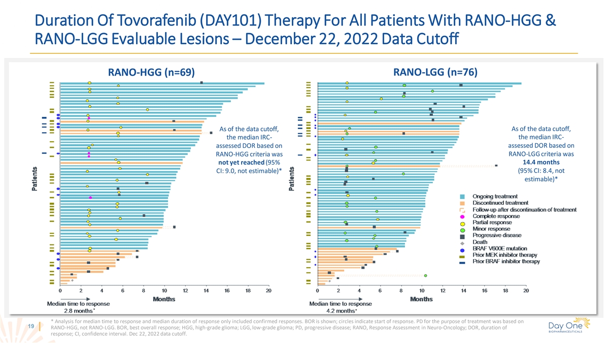 Duration Of Tovorafenib (DAY101) Therapy For All Patients With RANO-HGG & RANO-LGG Evaluable Lesions – December 22, 2022 Data Cutoff RANO-LGG (n=76) RANO-HGG (n=69) As of the data cutoff, As of the data cutoff, the median IRC- the median IRC- assessed DOR based on assessed DOR based on RANO-HGG criteria was RANO-LGG criteria was not yet reached (95% 14.4 months (95% CI: 8.4, not CI: 9.0, not estimable)* estimable)* * * * Analysis for median time to response and median duration of response only included confirmed responses. BOR is shown; circles indicate start of response. PD for the purpose of treatment was based on 19 RANO-HGG, not RANO-LGG. BOR, best overall response; HGG, high-grade glioma; LGG, low-grade glioma; PD, progressive disease; RANO, Response Assessment in Neuro-Oncology; DOR, duration of response; CI, confidence interval. Dec 22, 2022 data cutoff.