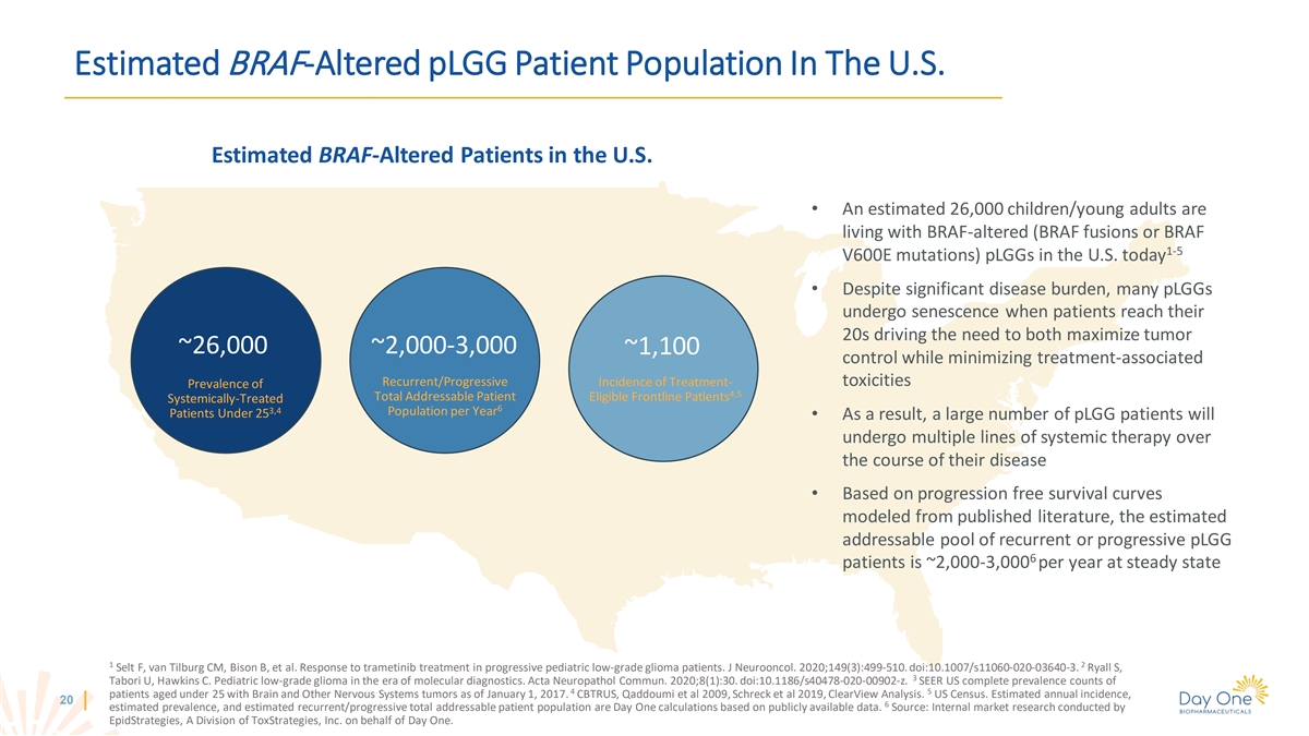 Estimated BRAF-Altered pLGG Patient Population In The U.S. Estimated BRAF-Altered Patients in the U.S. • An estimated 26,000 children/young adults are living with BRAF-altered (BRAF fusions or BRAF 1-5 V600E mutations) pLGGs in the U.S. today • Despite significant disease burden, many pLGGs undergo senescence when patients reach their 20s driving the need to both maximize tumor ~26,000 ~2,000-3,000 ~1,100 control while minimizing treatment-associated Recurrent/Progressive Incidence of Treatment- toxicities Prevalence of 4,5 Total Addressable Patient Eligible Frontline Patients Systemically-Treated 6 3,4 Population per Year Patients Under 25 • As a result, a large number of pLGG patients will undergo multiple lines of systemic therapy over the course of their disease • Based on progression free survival curves modeled from published literature, the estimated addressable pool of recurrent or progressive pLGG 6 patients is ~2,000-3,000 per year at steady state 1 2 Selt F, van Tilburg CM, Bison B, et al. Response to trametinib treatment in progressive pediatric low-grade glioma patients. J Neurooncol. 2020;149(3):499-510. doi:10.1007/s11060-020-03640-3. Ryall S, 3 Tabori U, Hawkins C. Pediatric low-grade glioma in the era of molecular diagnostics. Acta Neuropathol Commun. 2020;8(1):30. doi:10.1186/s40478-020-00902-z. SEER US complete prevalence counts of 4 5 patients aged under 25 with Brain and Other Nervous Systems tumors as of January 1, 2017. CBTRUS, Qaddoumi et al 2009, Schreck et al 2019, ClearView Analysis. US Census. Estimated annual incidence, 20 6 estimated prevalence, and estimated recurrent/progressive total addressable patient population are Day One calculations based on publicly available data. Source: Internal market research conducted by EpidStrategies, A Division of ToxStrategies, Inc. on behalf of Day One.