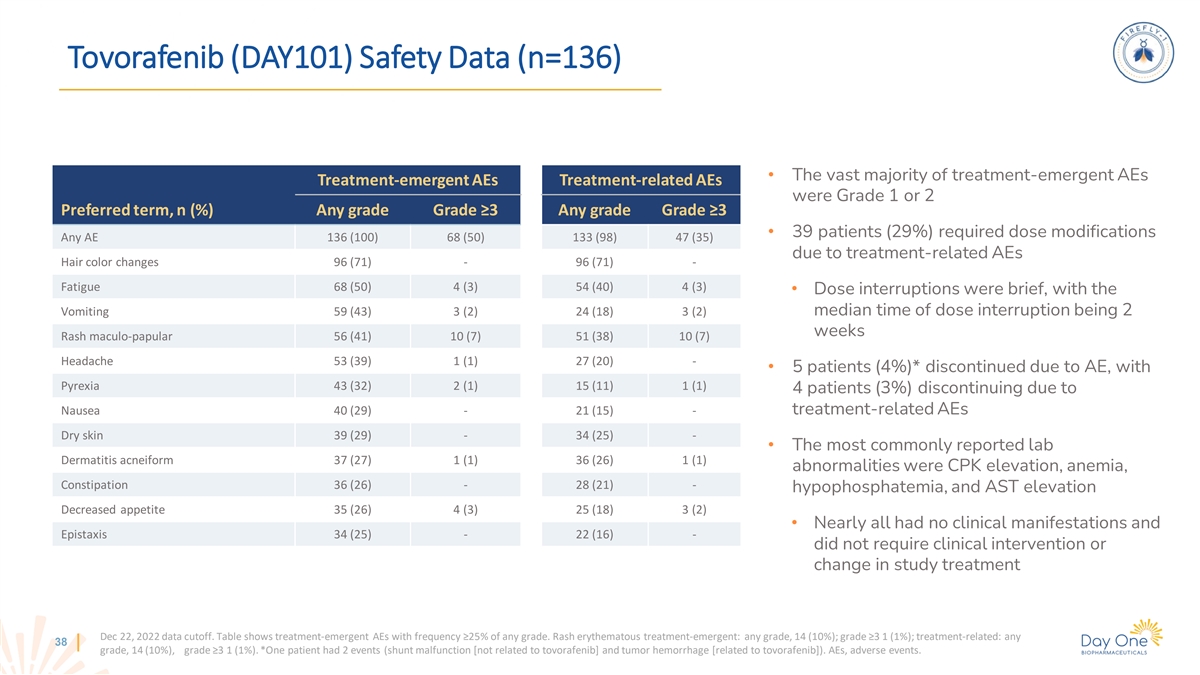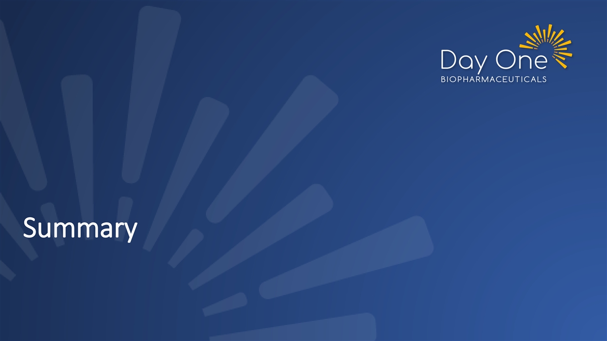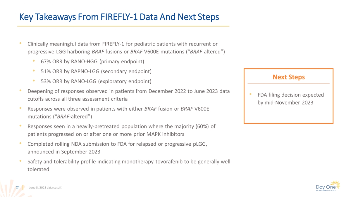 Topline Data From Ongoing, Fully Enrolled And NDA Submitted Pivotal Phase 2 FIREFLY-1 Trial – June 5, 2023 Data Cutoff RANO-HGG RAPNO-LGG RANO-LGG (n=69)* (n=76)* (N=76)* ORR, n (%) 46 (67%) 39 (51%) 40 (53%) CBR, n (%) 64 (93%) 62 (82%) 63 (83%) Best Overall Response, n (%) Complete Response (CR) 12 (17%) - - Partial Response (PR; >=50% reduction in SPPD) 34 (49%) 28 (37%) 20 (26%) Minor Response (MR; >=25 to <50% reduction in SPPD) NA 11 (14%) 20 (26%) Stable Disease (SD; +25% to -25% change in SPPD) 18 (26%) 23 (30%) 23 (30%) Duration of Response (DOR) (months) 16.6 13.8 14.4 Median DOR (95% CI) (11.6, not estimable) (11.3, not estimable) (11.0, not estimable) Median duration of tovorafenib treatment of 15.8 months, with 66% of patients remaining on treatment June 5, 2023 data cutoff. RANO-HGG ORR (CR + PR). RAPNO-LGG & RANO-LGG ORR (CR + PR + MR), SPPD, Sum of Perpendicular Diameters. CBR, Clinical Benefit Rate (CR + PR + MR + SD). * Indicates the 13 response criteria–evaluable patients within the n=77 Arm 1 population.