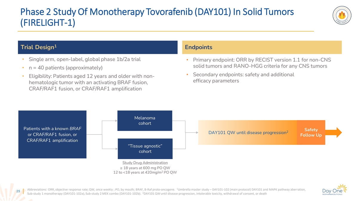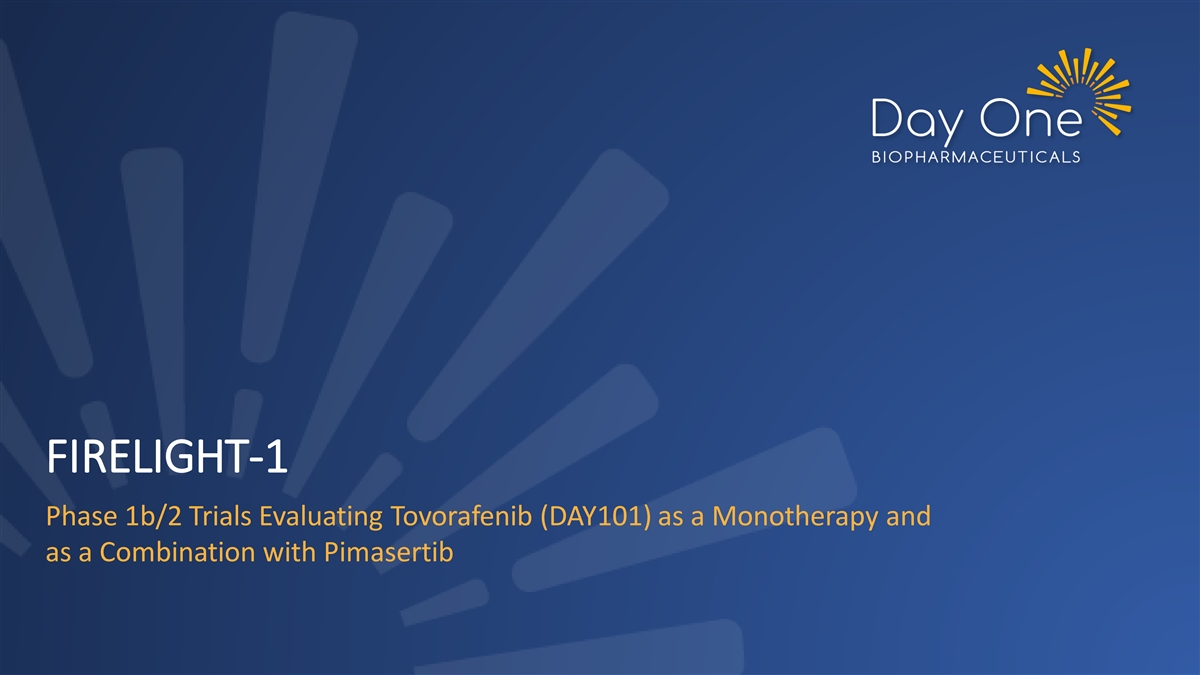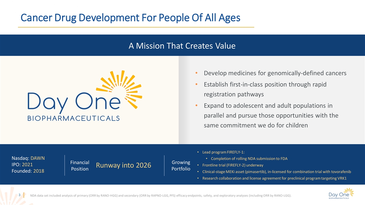 Cancer Drug Development For People Of All Ages A Mission That Creates Value • Develop medicines for genomically-defined cancers • Establish first-in-class position through rapid registration pathways • Expand to adolescent and adult populations in parallel and pursue those opportunities with the same commitment we do for children • Lead program FIREFLY-1: Nasdaq: DAWN • Completion of rolling NDA submission to FDA Financial Growing IPO: 2021 • Frontline trial (FIREFLY-2) underway Runway into 2026 Position Portfolio Founded: 2018 • Clinical-stage MEKi asset (pimasertib), in-licensed for combination trial with tovorafenib • Research collaboration and license agreement for preclinical program targeting VRK1 3 NDA data set included analysis of primary (ORR by RANO-HGG) and secondary (ORR by RAPNO-LGG, PFS) efficacy endpoints, safety, and exploratory analyses (including ORR by RANO-LGG).