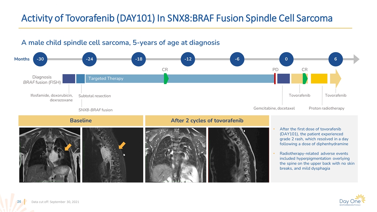 Activity of Tovorafenib (DAY101) In SNX8:BRAF Fusion Spindle Cell Sarcoma A male child spindle cell sarcoma, 5-years of age at diagnosis Months -30 -24 -18 -12 -6 0 6 CR PD CR Diagnosis Targeted Therapy BRAF fusion (FISH) Ifosfamide, doxorubicin, Tovorafenib Tovorafenib Subtotal resection dexrazoxane Gemcitabine, docetaxel Proton radiotherapy SNX8-BRAF fusion Baseline After 2 cycles of tovorafenib • After the first dose of tovorafenib (DAY101), the patient experienced grade 2 rash, which resolved in a day following a dose of diphenhydramine • Radiotherapy-related adverse events included hyperpigmentation overlying the spine on the upper back with no skin breaks, and mild dysphagia 26 Data cut off: September 30, 2021